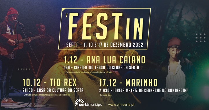 O mês de dezembro traz consigo a quinta edição do Fest-In, festival de música de bandas portuguesas com identidade cultural muito própria, que decorre em espaços que potenciam um ambiente mais intimista e de maior partilha entre bandas e público. À semelhança das edições anteriores, a programação variada e singular pretende fazer chegar a todos a boa música. Promovida pelo Município da Sertã, a quinta edição do Fest-In apresenta os nomes de Ana Lua Caiano (01.12), Tio Rex (10.12) e Marinho (17.12), e irá passar pelo Cineteatro Tasso do Clube da Sertã, Casa da Cultura da Sertã e Igreja Matriz de Cernache do Bonjardim.