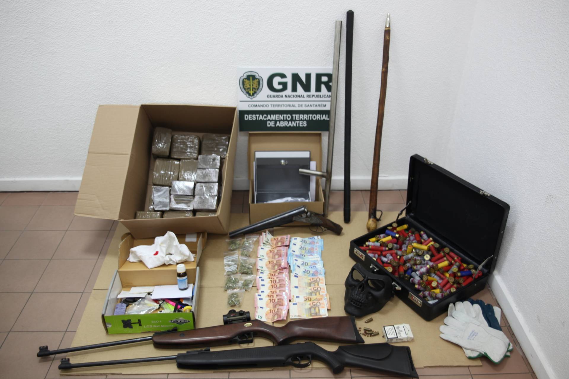 O suspeito foi detido e foram efetuadas buscas domiciliárias, tendo sido apreendido: 16 500 gramas de haxixe, equivalente a cerca de 33 mil doses; 25,5 gramas de cannabis; 3 armas de fogo; 3 bastões; 213 munições de diversos calibres; 980 euros em numerário; um veículo automóvel e um telemóvel.