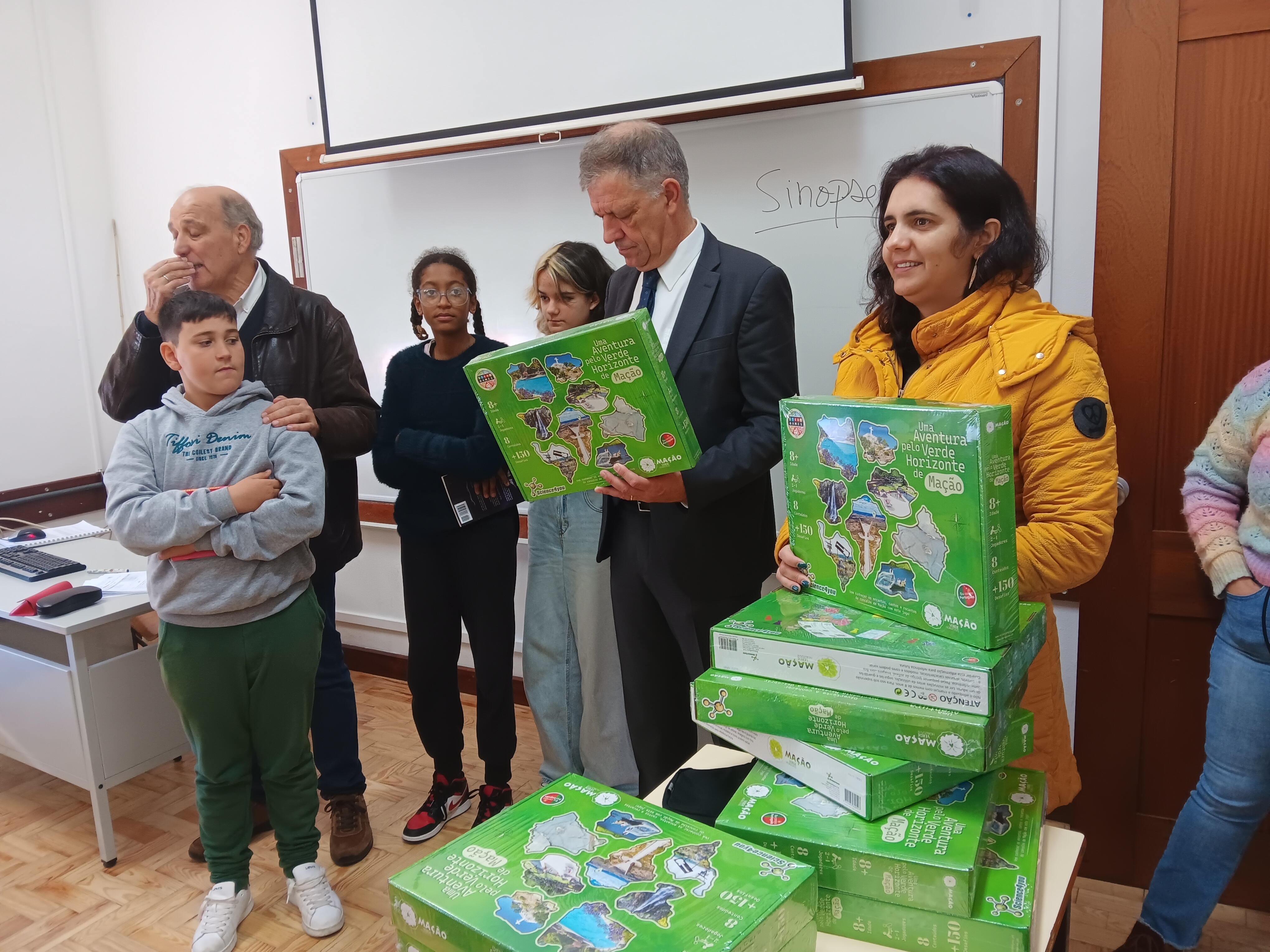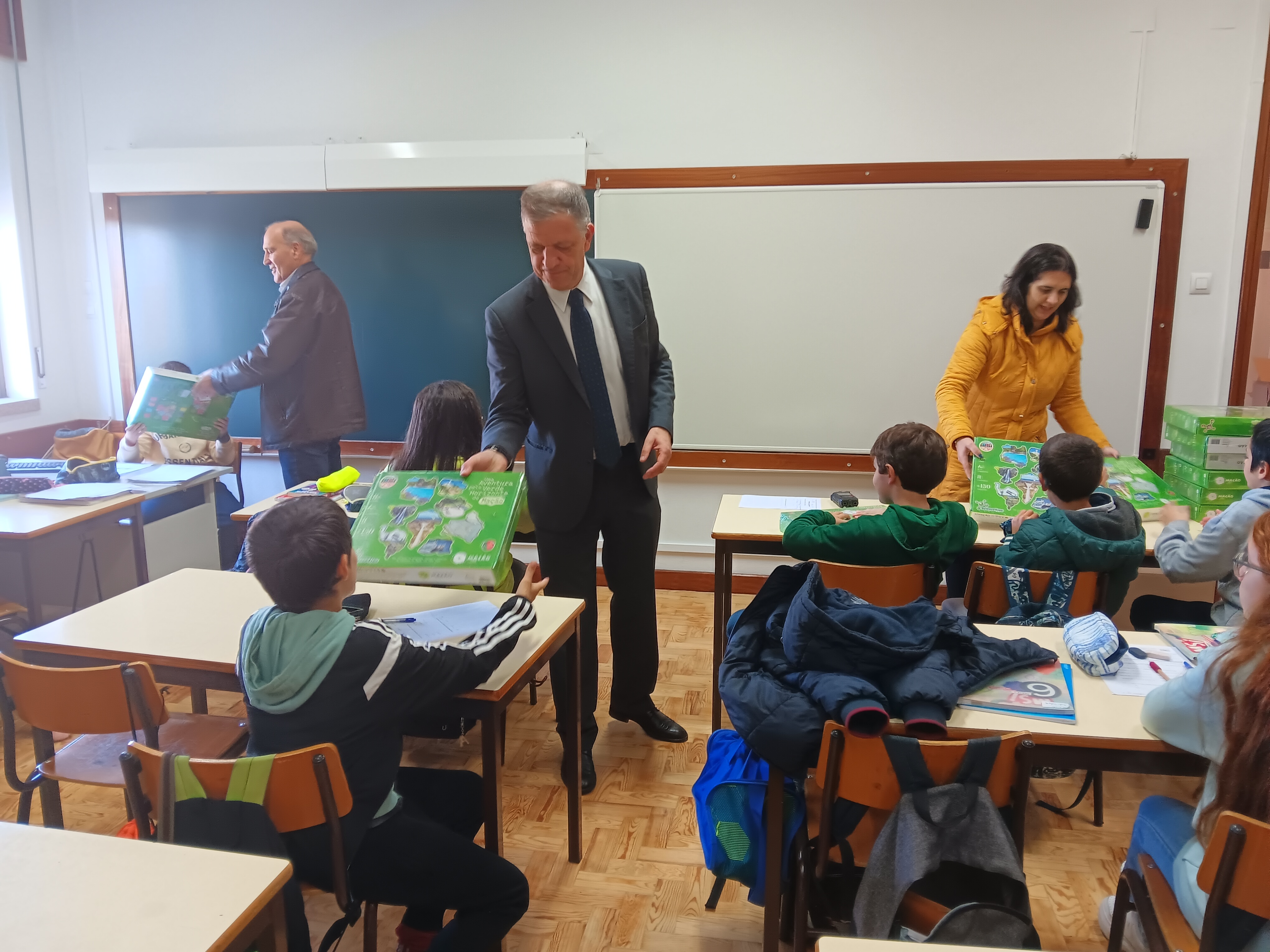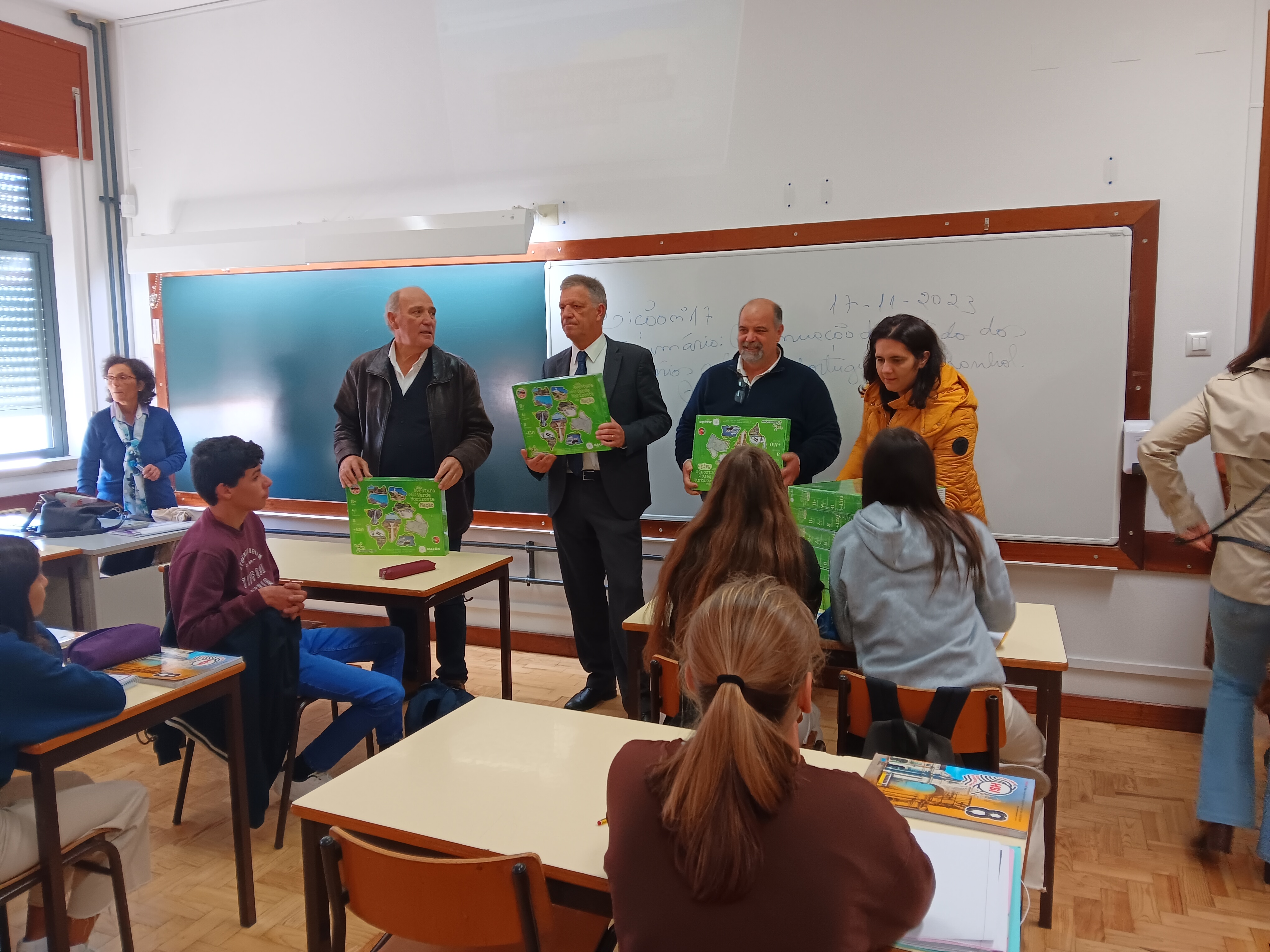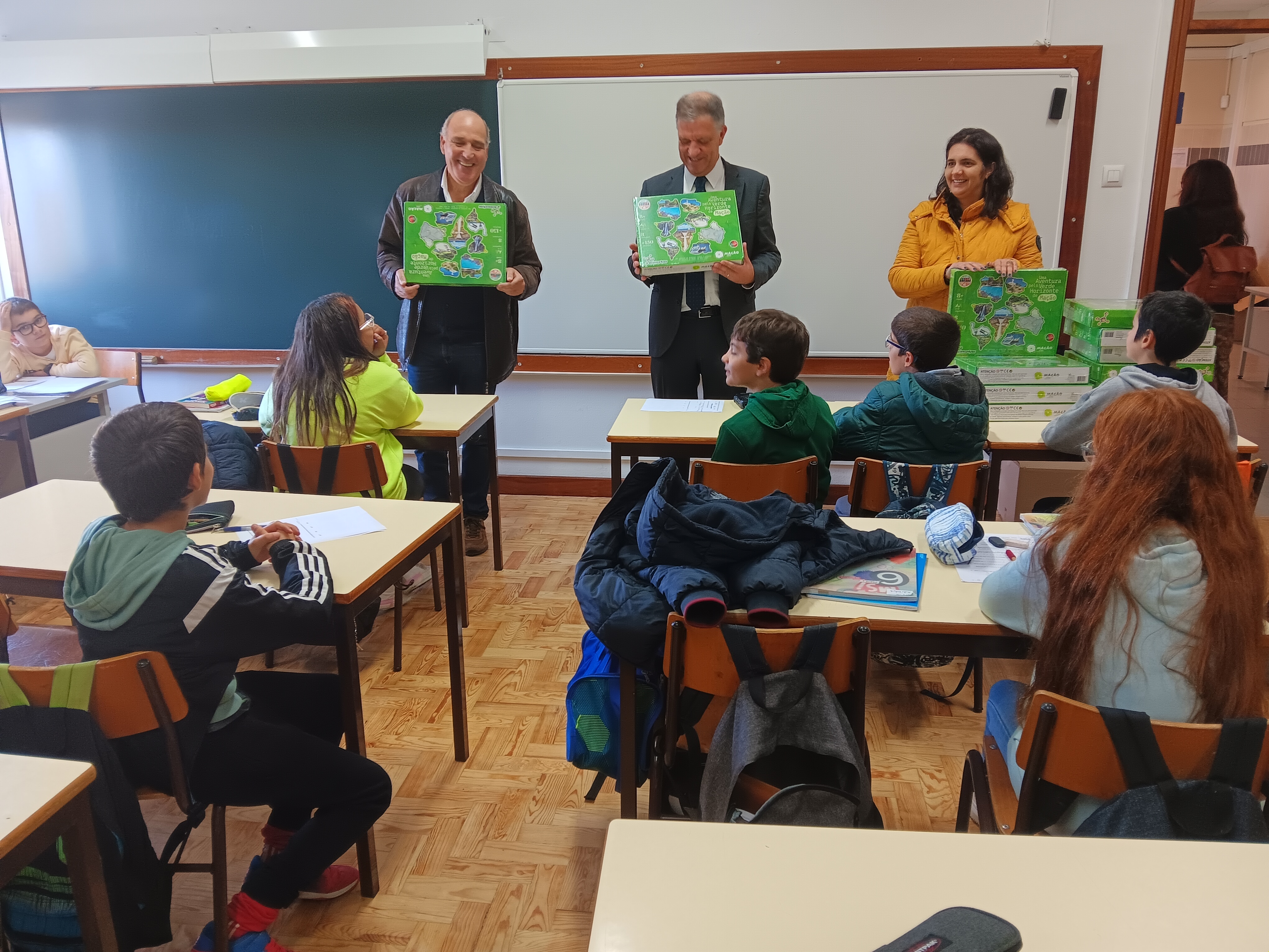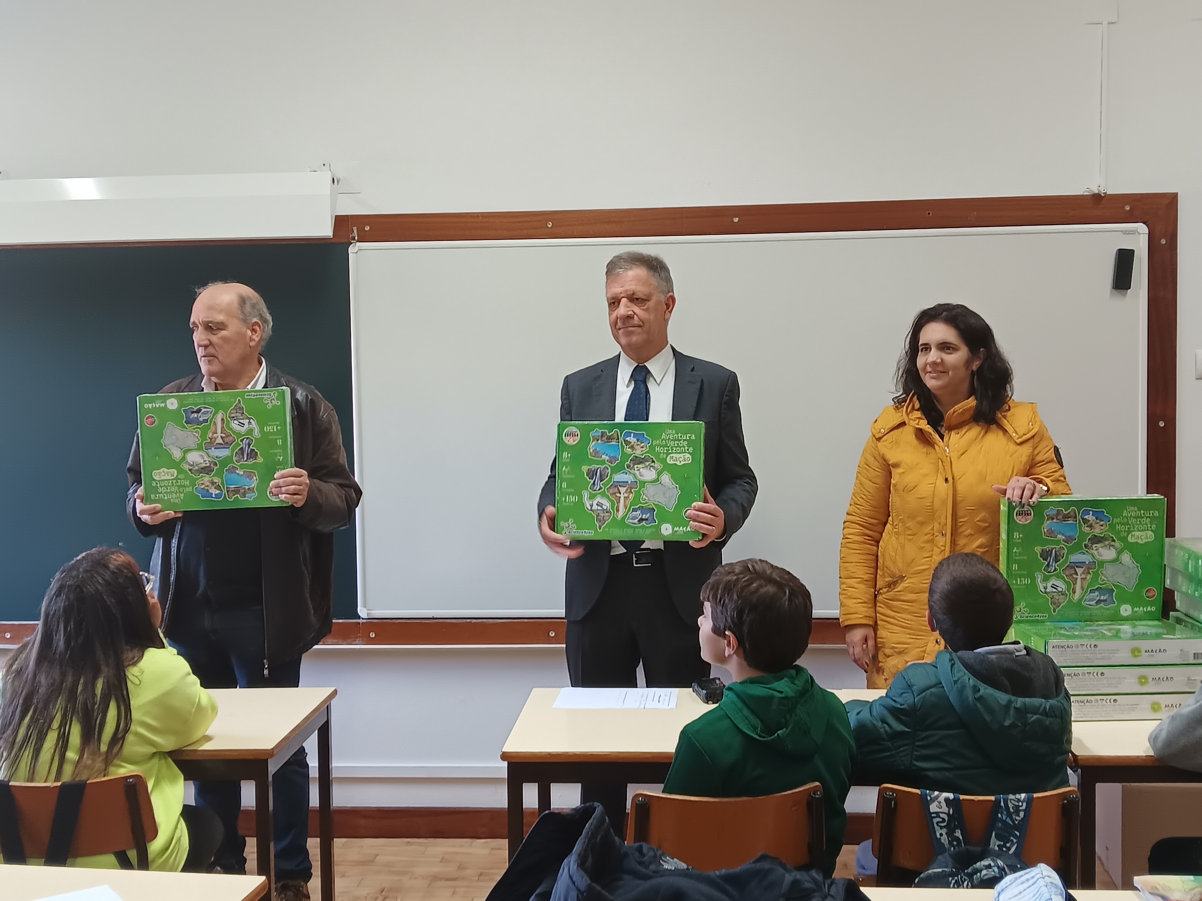 Os estudantes receberam o jogo "Uma Aventura pelo Verde Horizonte de Mação" esta manhã pelas mãos do presidente da Câmara Municipal, Vasco Estrela, acompanhado pelo vice-presidente António Louro e pela vereadora Margarida Lopes, bem como pelo diretor do Agrupamento, José António Almeida.