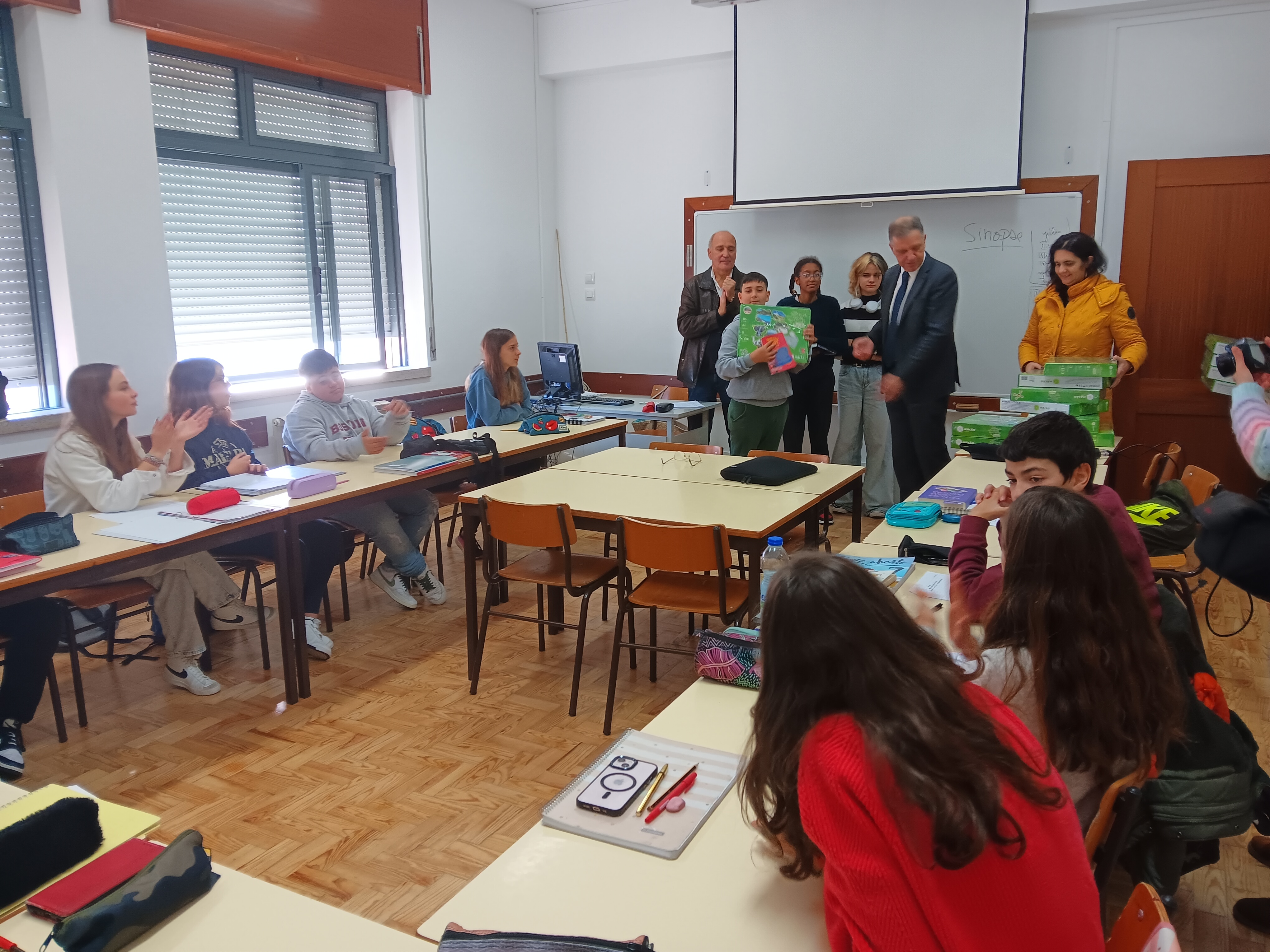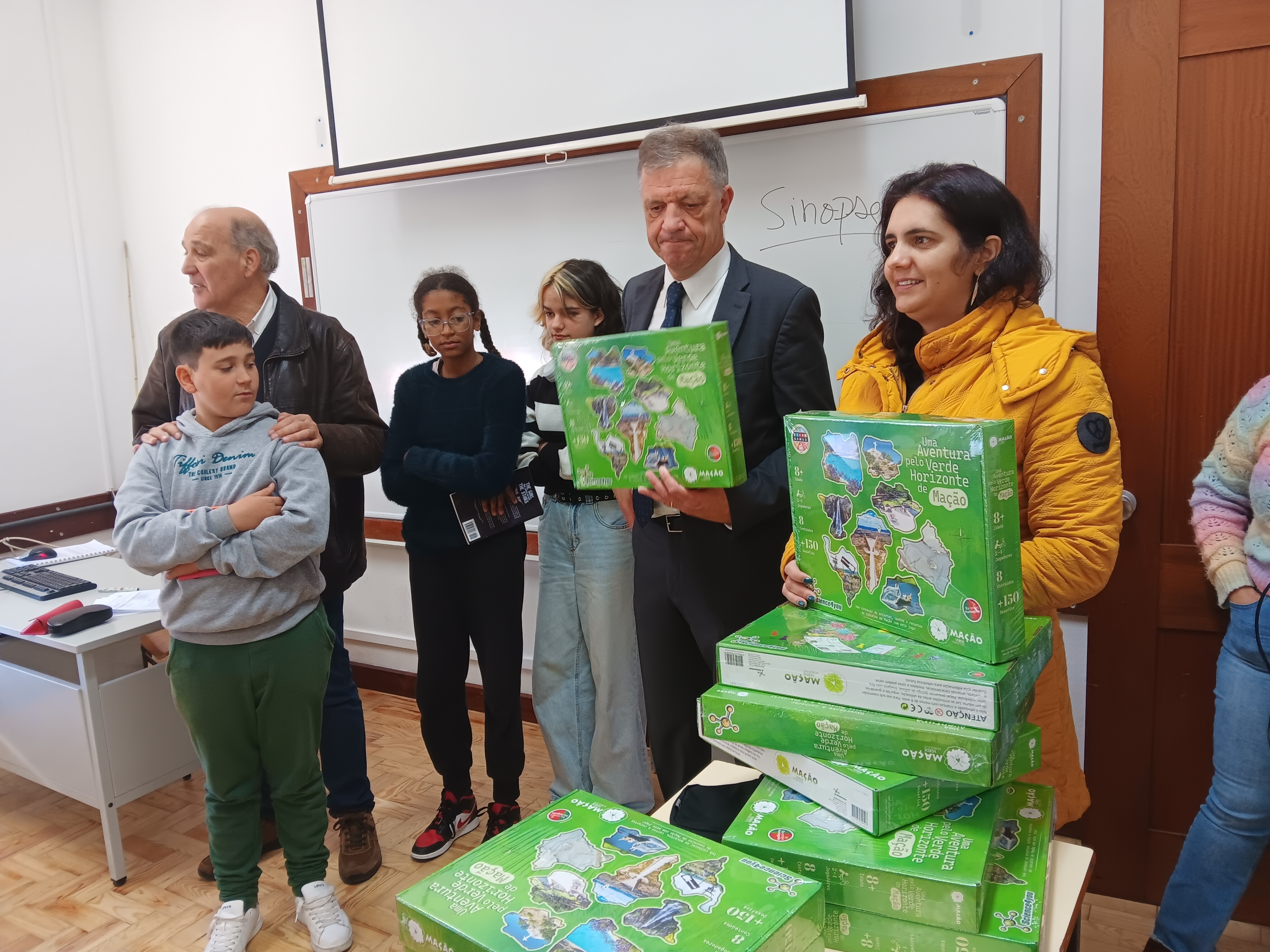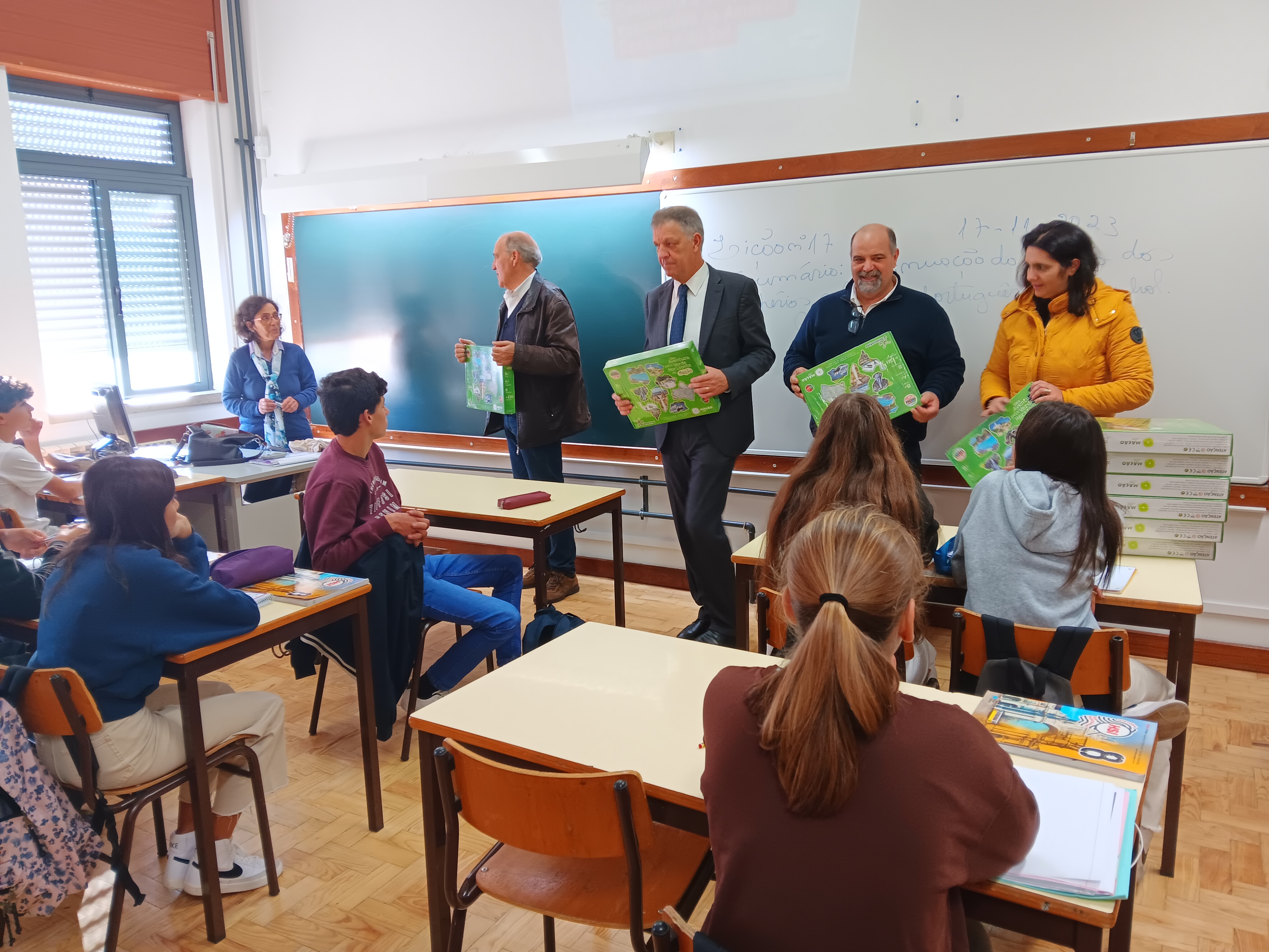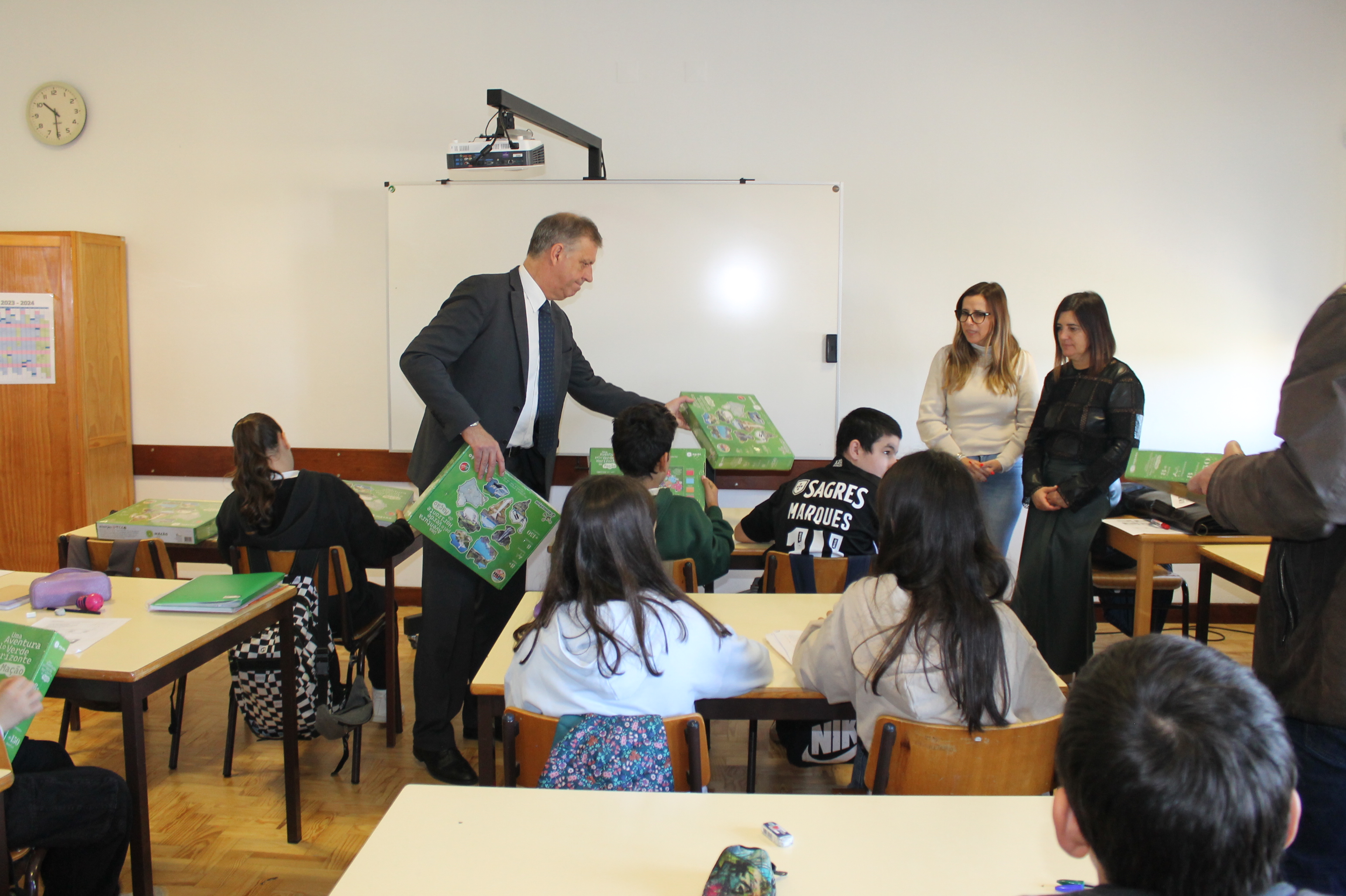 Os estudantes receberam o jogo "Uma Aventura pelo Verde Horizonte de Mação" esta manhã pelas mãos do presidente da Câmara Municipal, Vasco Estrela, acompanhado pelo vice-presidente António Louro e pela vereadora Margarida Lopes, bem como pelo diretor do Agrupamento, José António Almeida.