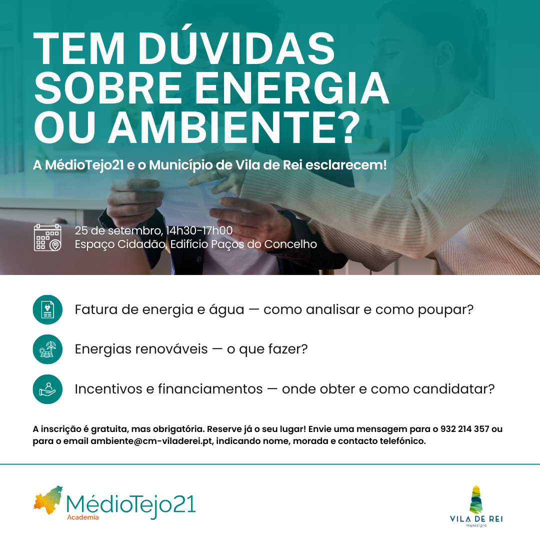 No próximo dia 25 de setembro, entre as 14h30 e as 17h, no Espaço Cidadão no Edifício Paços do Concelho de Vila de Rei, e numa parceria entre o Município de Vila de Rei e a MédioTejo21 - Agência Regional de Energia e Ambiente, decorrerão atendimentos individuais, onde os interessados poderão obter informações ou apoio sobre temas cruciais para a gestão dos seus consumos energéticos e para a transição energética, como por exemplo: Interpretação das faturas de energia e água; Aconselhamento na aquisição de energia; Aconselhamento no acesso a incentivos e obtenção de financiamento; Aconselhamento no âmbito da implementação de medidas de energia renovável.