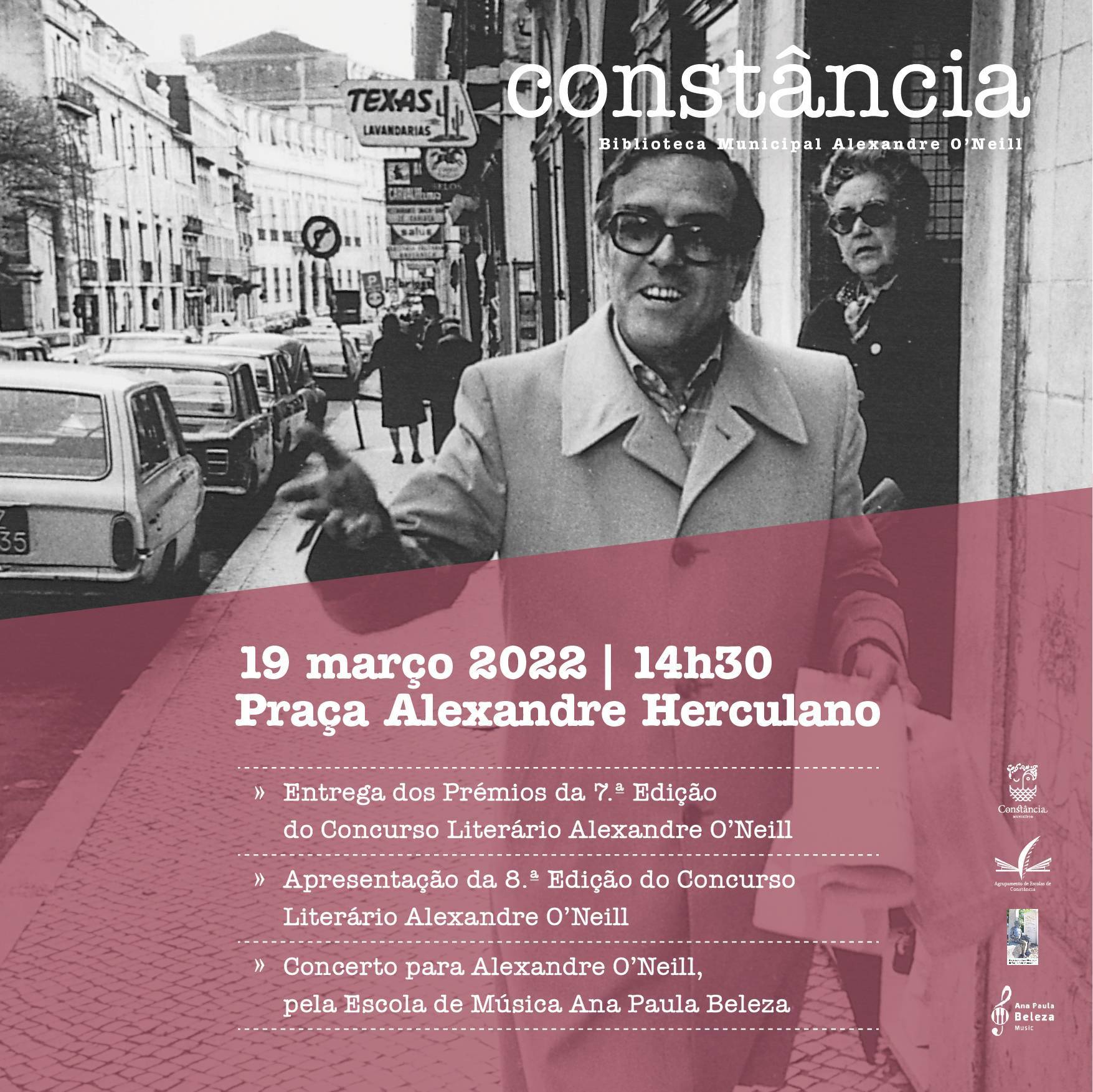 Registe-se que o Concurso Literário Alexandre O’Neill, que conta este ano com a sua oitava edição, é promovido pelo Município de Constância, através da Biblioteca Municipal Alexandre O’Neill, com o propósito de valorizar e divulgar este grande nome da literatura portuguesa, assim como a sua relação com a Biblioteca Municipal e a vila de Constância, visando também fomentar e consolidar hábitos de leitura, de escrita e de criação artística na comunidade.