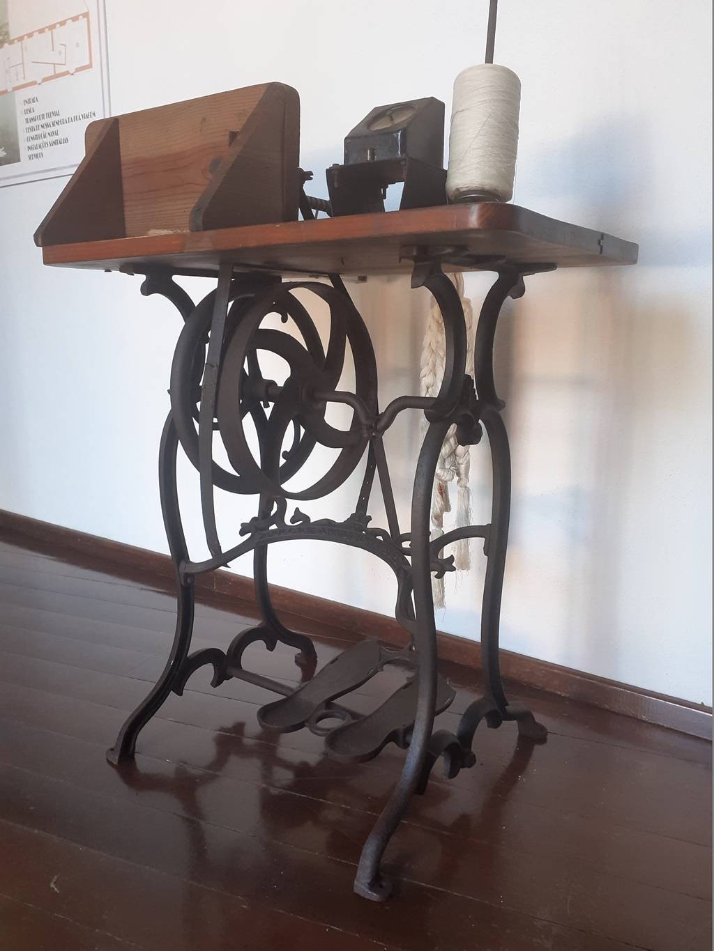 A máquina de bobinar, agora em destaque no Museu dos Rios e das Artes Marítimas, tem a base em ferro forjado com elementos decorativos florais e com duas rodas para impulsionar o mecanismo. Tem ainda inscrito POLLACK SCHIMDT & Cº HAMBURG, empresa que comercializou esta máquina de costura a partir de 1868. Na parte superior, tem um tampo em madeira com mecanismos modernos adaptados para fazer pequenas bobines de linha.
