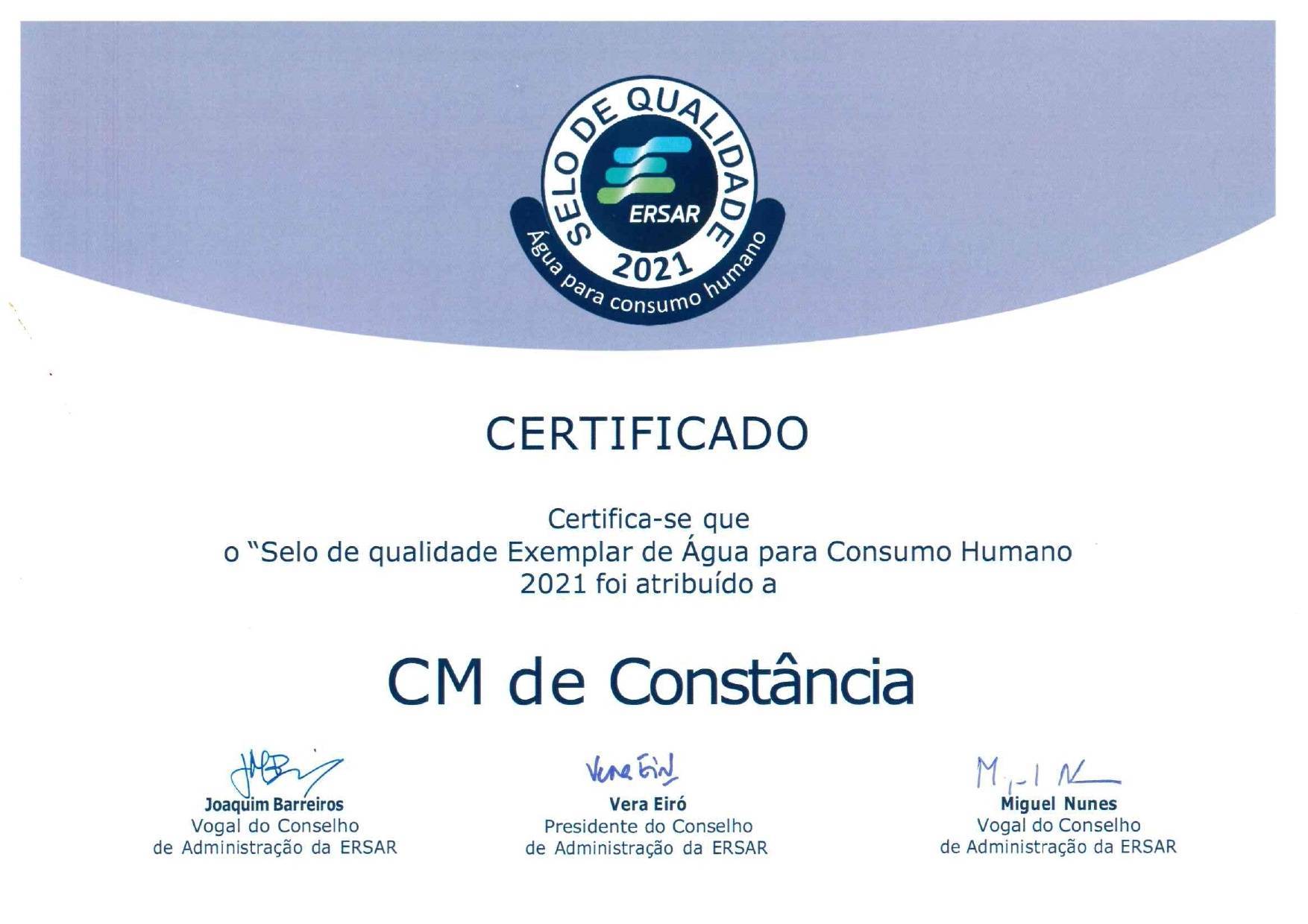 O Município de Constância foi distinguido com o Selo de Qualidade Exemplar de Água para Consumo Humano 2021, numa cerimónia que decorreu em Lisboa, no âmbito da 16º Expo Conferência da Água, um evento que contou com a presença do presidente da Câmara Municipal, Sérgio Oliveira e do vereador do Ambiente, Pedro Pereira.