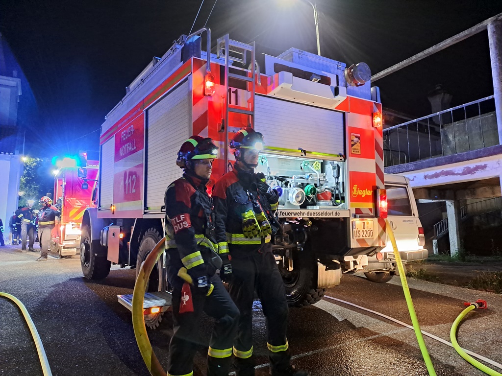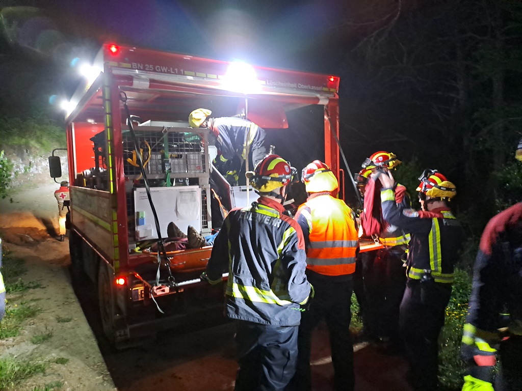 A equipa de bombeiros da região de Bona chega ao local e posiciona os meios antes de avançar no terreno para resgatar “os dois idosos.”