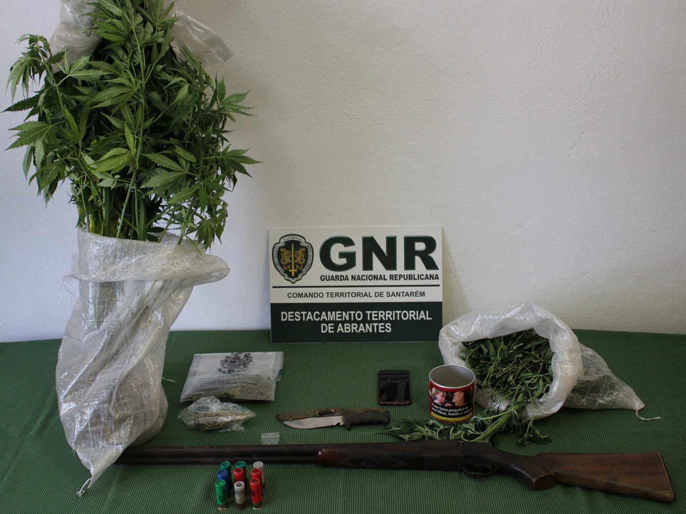 Em comunicado a GNR indica que no âmbito de um processo por tráfico de estupefacientes, os militares da Guarda realizaram diligências que culminaram com o cumprimento de um mandado de busca em residência, tendo sido verificado a existência de produto estupefaciente e material relacionado com o tráfico de estupefacientes. No decorrer da ação foi apreendido o seguinte material: nove munições; seis pés de canábis; uma dose de haxixe; uma caçadeira; uma faca; um telemóvel; e várias sementes e sobrantes de plantas de canábis em processo de secagem.