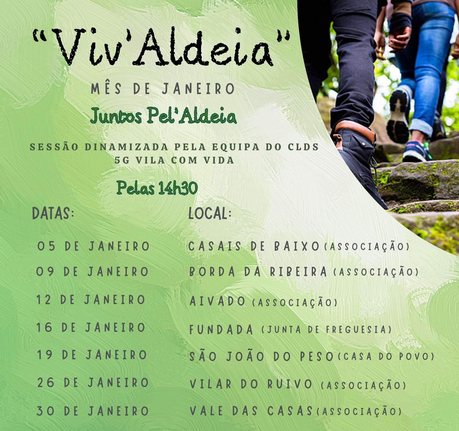 A ação consiste na realização de um passeio pedestre pela aldeia, com o objetivo de valorizar as histórias, tradições e vivências locais, combater o isolamento social e identificar aquilo que é mais importante para a comunidade no seu território.