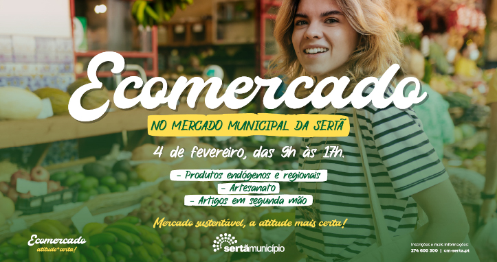 No próximo domingo, dia 4 de fevereiro, decorrerá mais uma edição do Ecomercado, entre as 9 e as 17 horas, no Mercado Municipal da Sertã. Esta iniciativa realiza-se mensalmente no primeiro domingo de cada mês e possibilita a aquisição de produtos endógenos diretamente do produtor, produtos regionais, artesanato, assim como artigos em segunda mão.