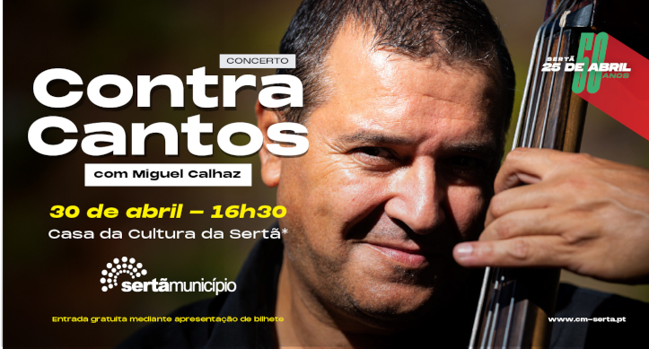 A entrada no concerto “ContraCantos” de Miguel Calhaz é gratuita mediante apresentação de bilhete, que poderá ser levantado antecipadamente na Casa da Cultura da Sertã (sem possibilidade de reservas). Este concerto irá encerrar as comemorações dos 50 anos do 25 de Abril, promovidas pelo Município da Sertã que, durante todo o mês de abril, abrangeram diversas iniciativas como exposições, sessão solene, concertos, conversas, teatro e cinema.