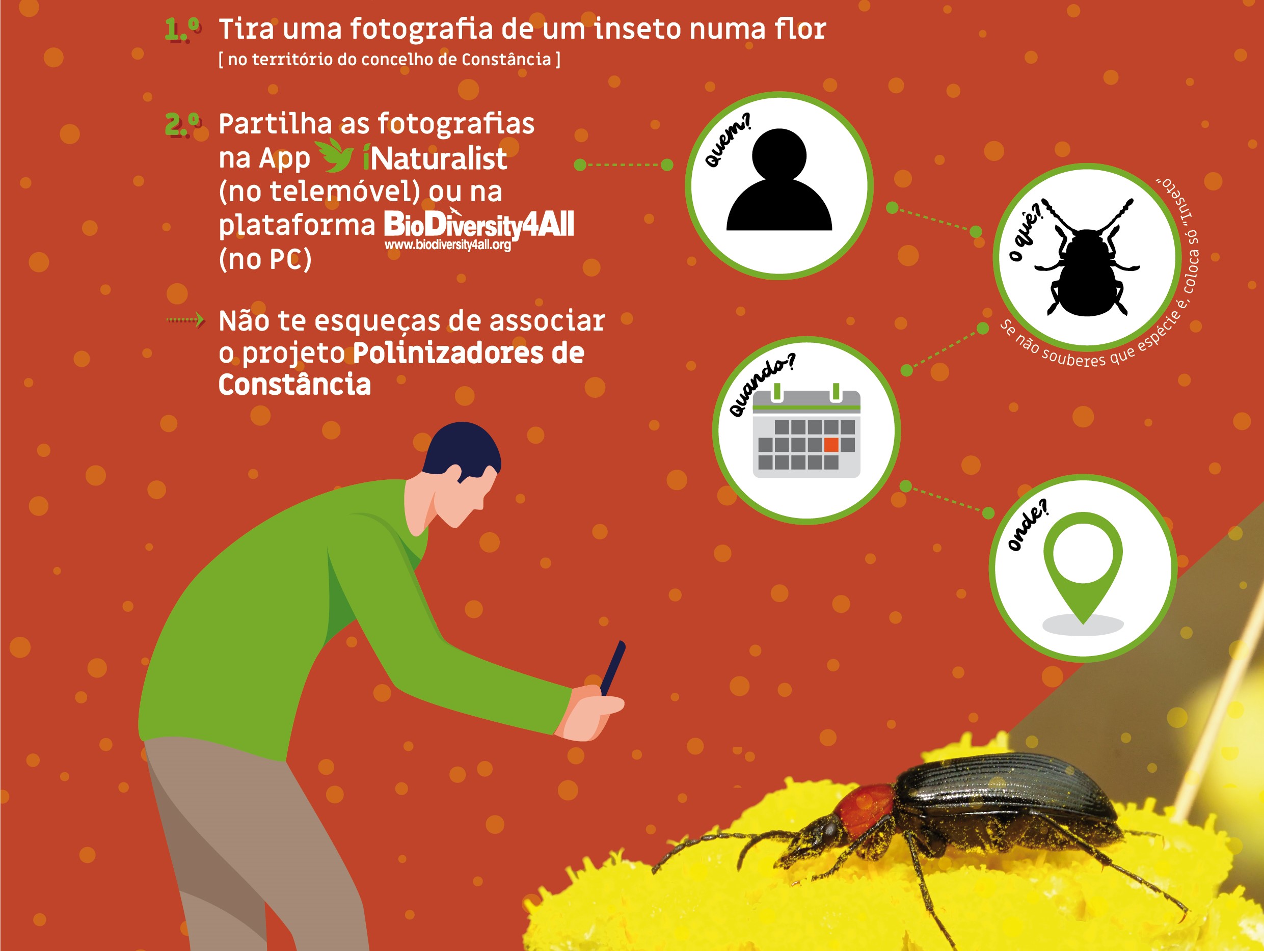 Com a realização da atividade «Vamos fotografar os insetos polinizadores de Constância» pretende-se desafiar os participantes (comunidade escolar, munícipes e todos os interessados) a descobrir que insetos asseguram a polinização das plantas com flor do concelho de Constância e simultaneamente dar a conhecer o projeto de ciência cidadã denominado Polinizadores de Portugal.