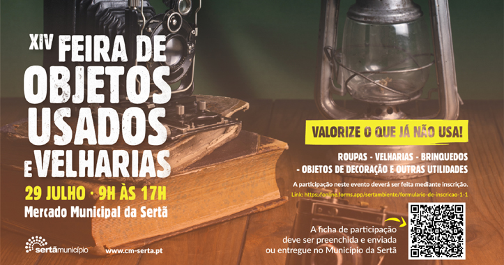 Os interessados em participar na venda de objetos usados deverão inscrever-se gratuitamente até 27 de julho, preenchendo o formulário online no link: https://cloud.cm-serta.pt/apps/forms/s/xSaas5NQMkxq2GopQn7BNz36.