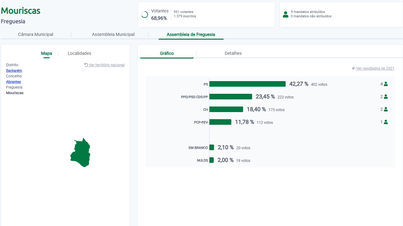 O PS elege dez deputados, menos dois do que em 2021, a AD sobe de quatro para seis deputados e o CHEGA avança de um para três eleitos. CDU e ALTERNATIVAcom conseguem eleger um deputado municipal.