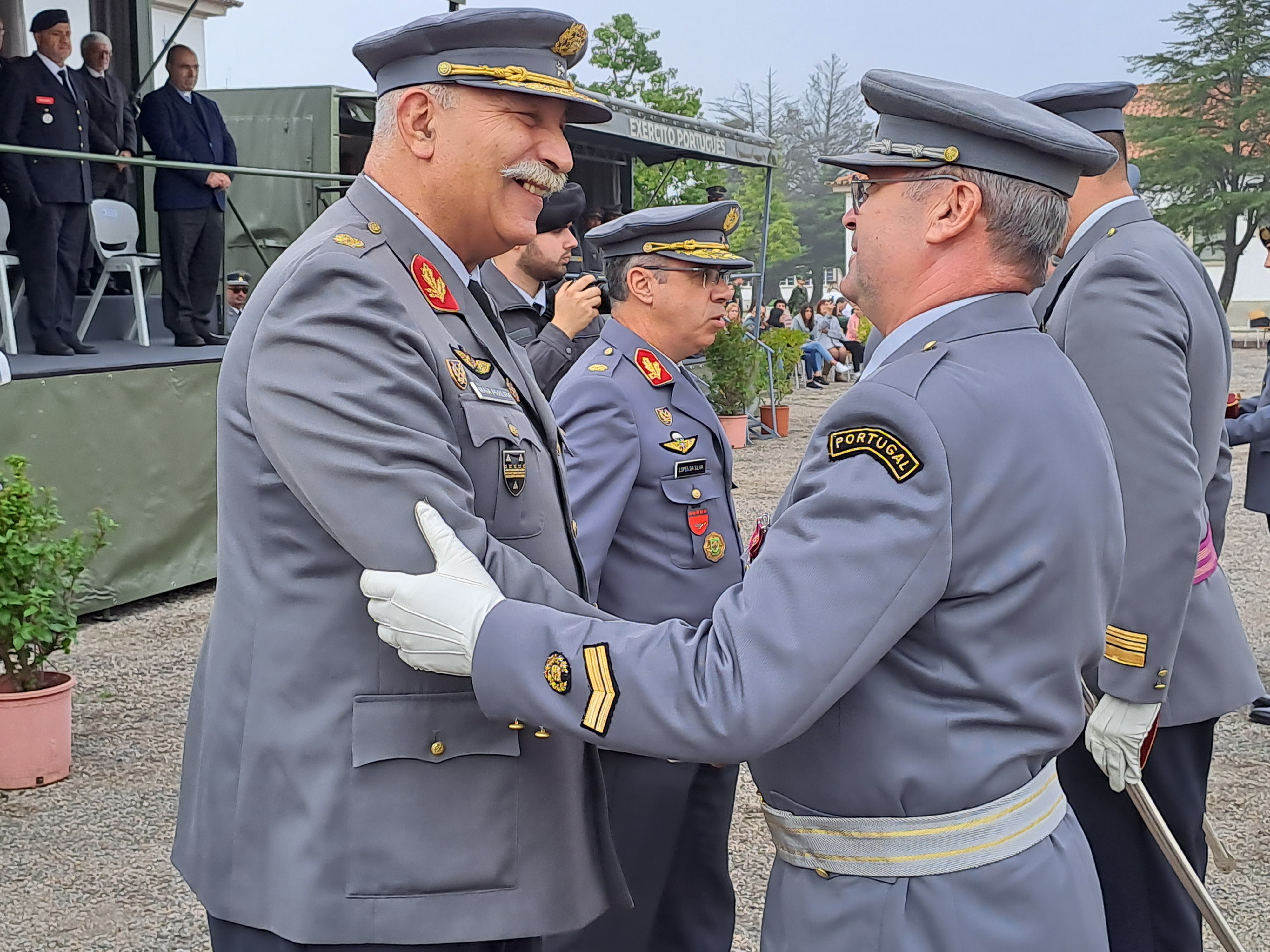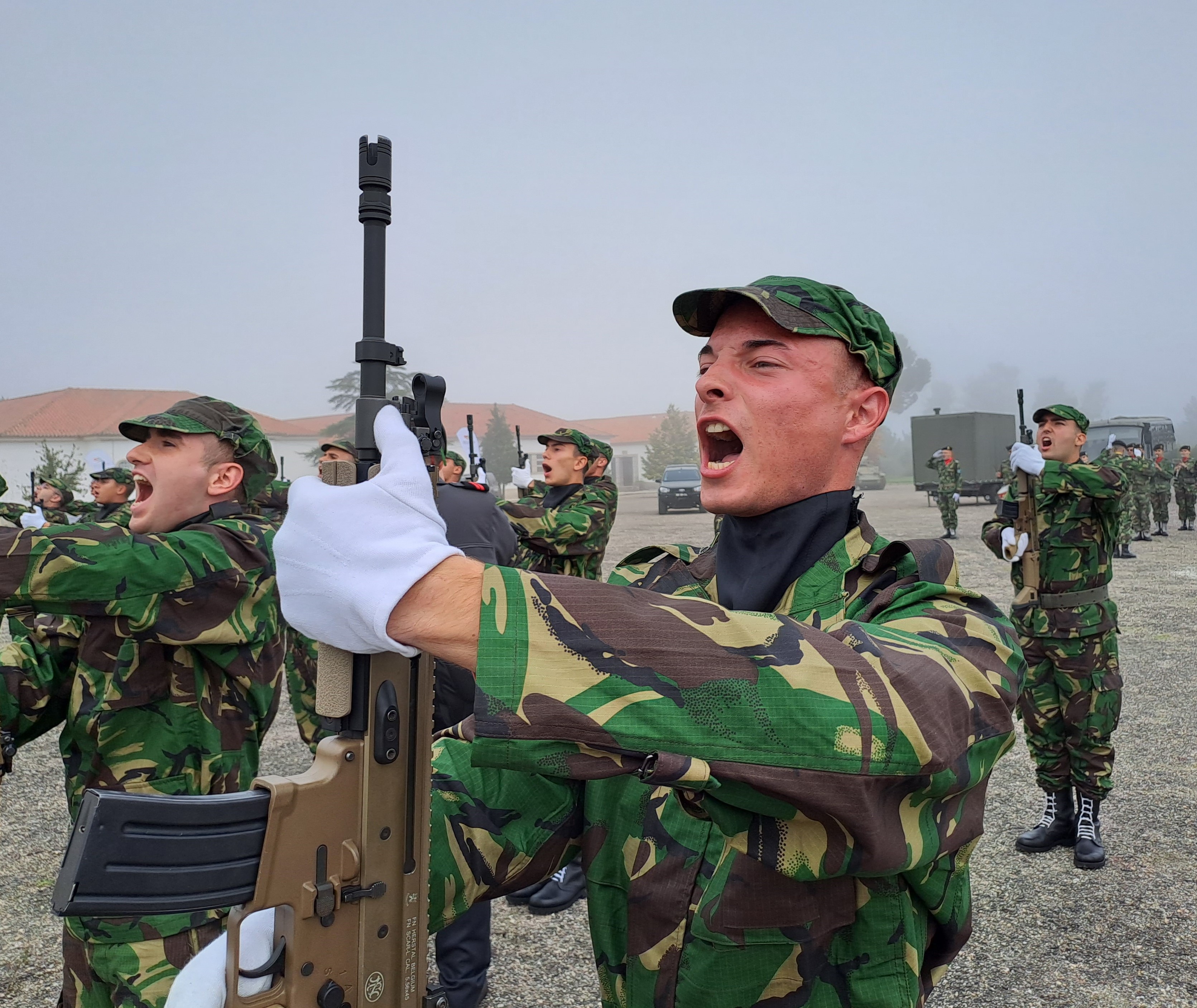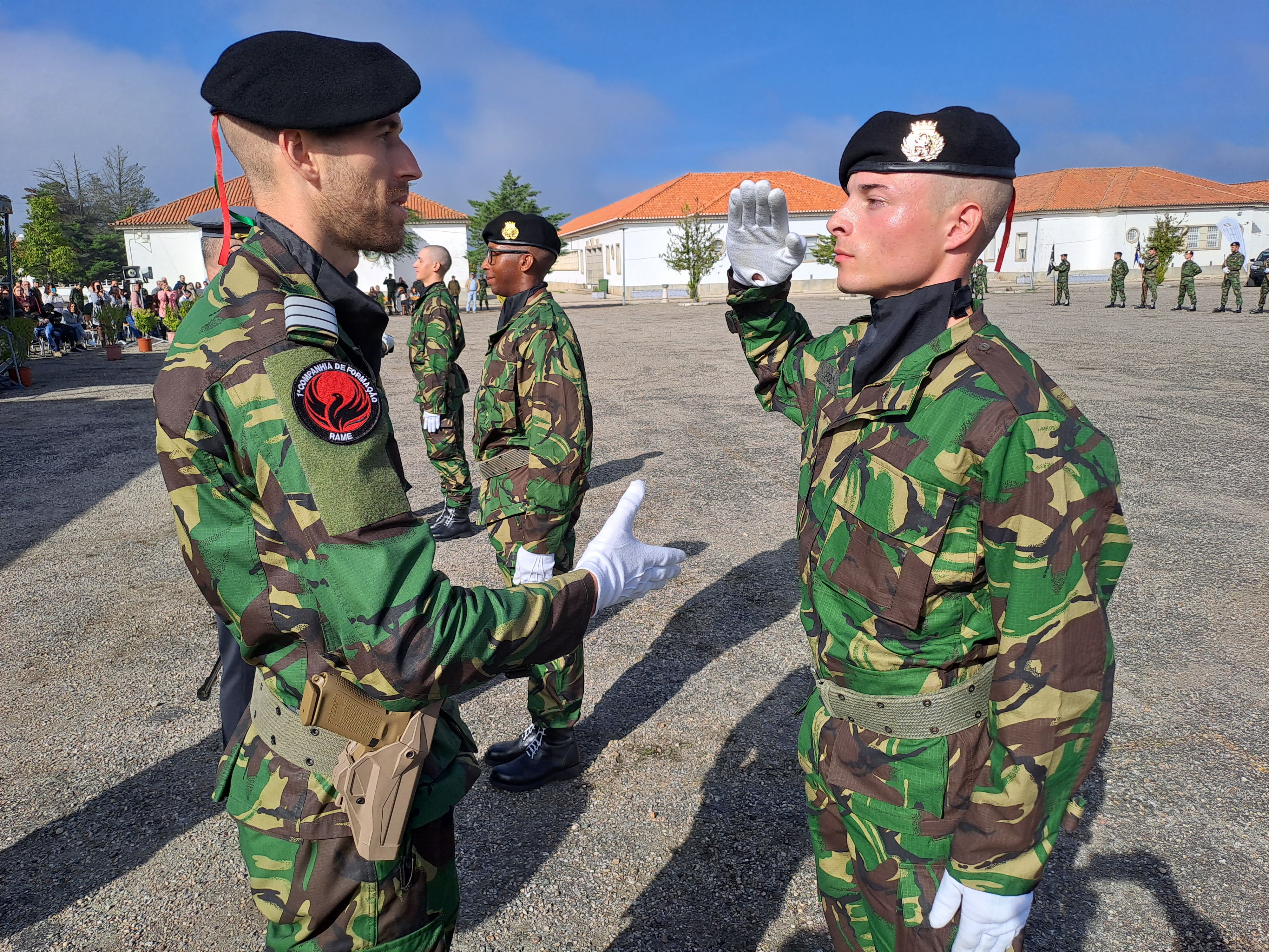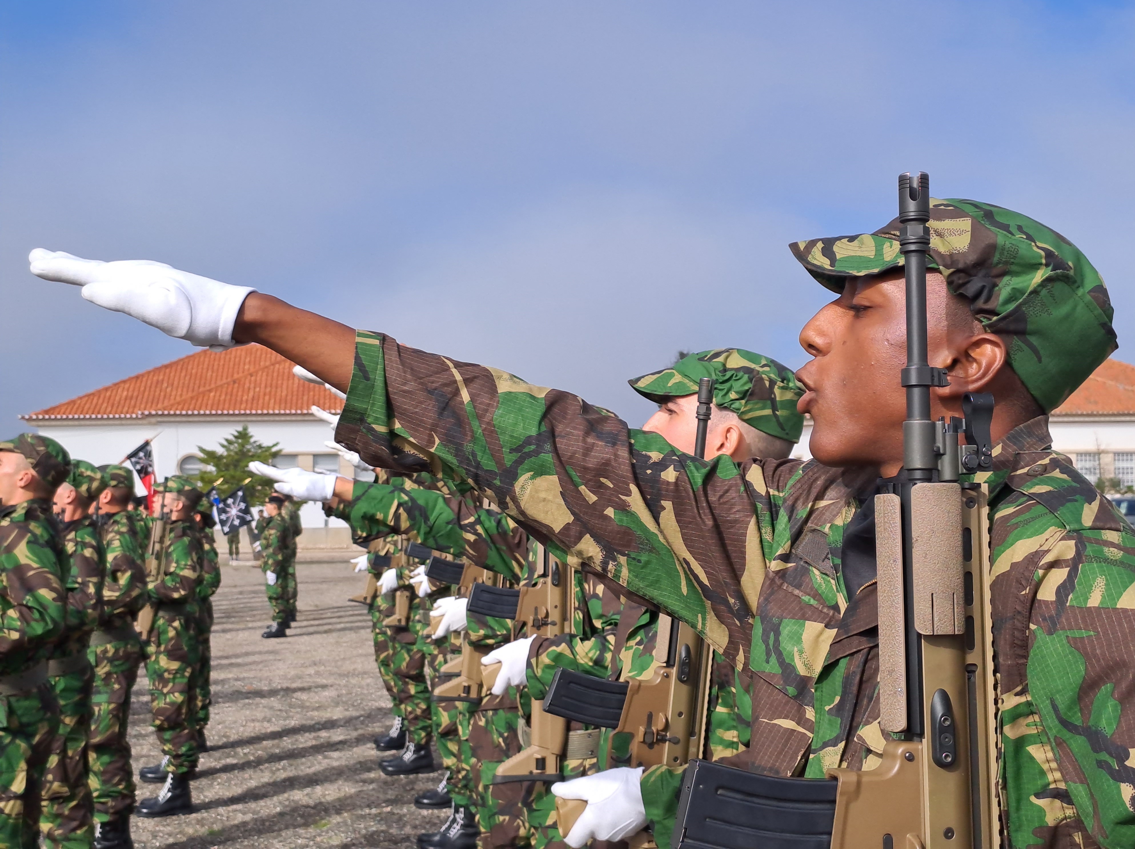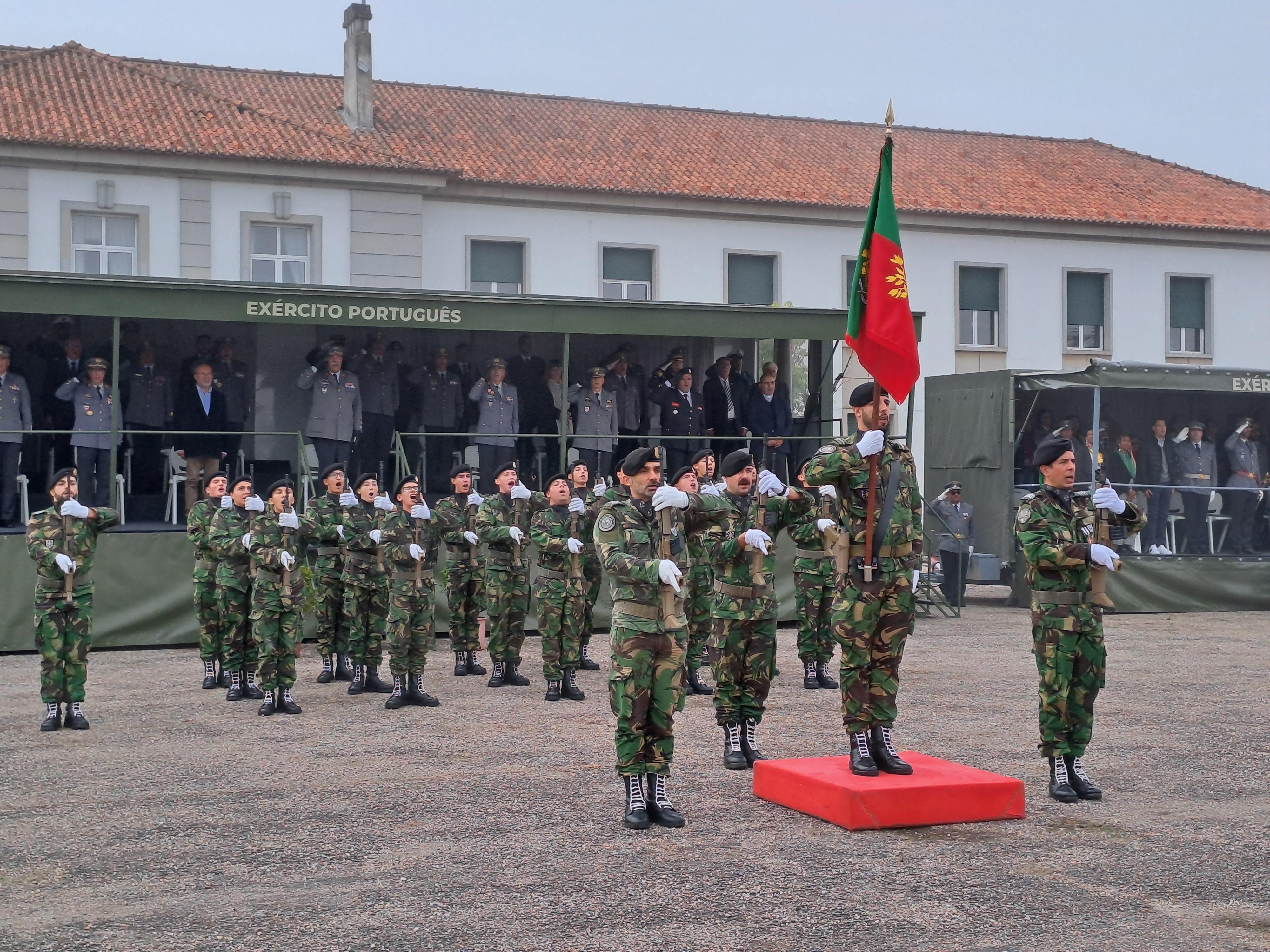 Depois os soldados conheceram os deveres militares e fizeram o juramento de bandeira, um momento da cerimónia com maior impacto, principalmente nas famílias e convidados dos soldados-recruta que estão presentes. E normal entre as máquinas fotográficas e telemóveis a registar o momento, aqui e ali caírem algumas lágrimas pelos rostos.