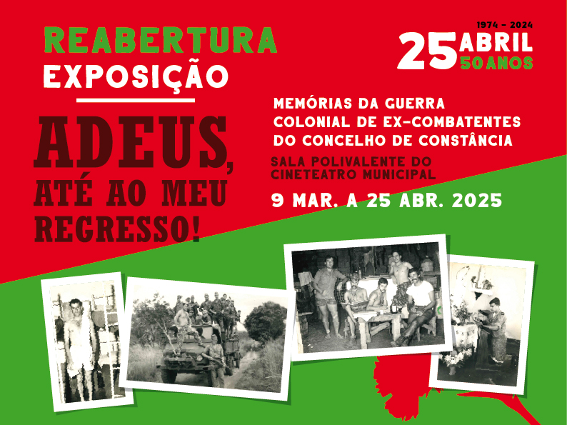 Assim, e para comemorar os 50 Anos do 25 de Abril, foi concebida a exposição “Adeus, até ao meu regresso! – Memórias da Guerra Colonial de Ex-combatentes do Concelho de Constância” para retratar o longo e difícil percurso militar e pessoal destes jovens, oriundos ou residentes no concelho de Constância. Além desta iniciativa, elaborou-se um filme intitulado “Memórias de Guerra”, de Tatiana Constantino, e ainda em 2025 será apresentada uma publicação de Miguel Luís sobre esta temática.