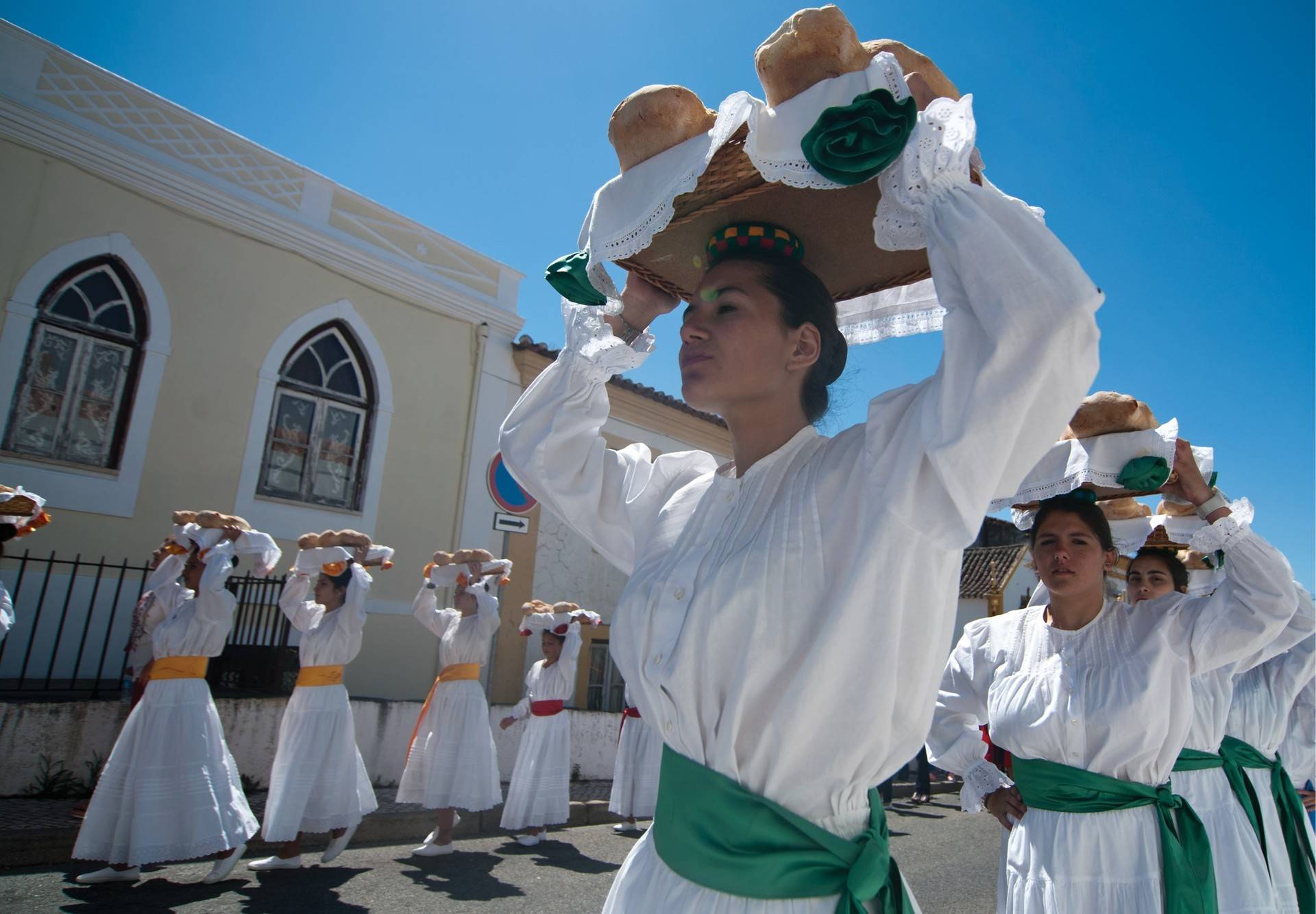 Finda a missa, pelas 11 horas terá lugar a Procissão até ao Convento de Santa Maria da Caridade. Explica o município em comunicado que nesta Procissão participam vinte jovens vestidas de branco, enquanto símbolo de pureza, que transportam à cabeça os tabuleiros com o pão benzido na Eucaristia. Estas jovens diferenciam-se pelas cintas coloridas que envergam, existindo quatro cores, uma por cada freguesia do Concelho. Integram também o Cortejo outros figurantes envergando trajes usados no Sardoal em finais do século XIX, ocasião em que as festividades se realizavam com grande imponência e vasta participação do povo.