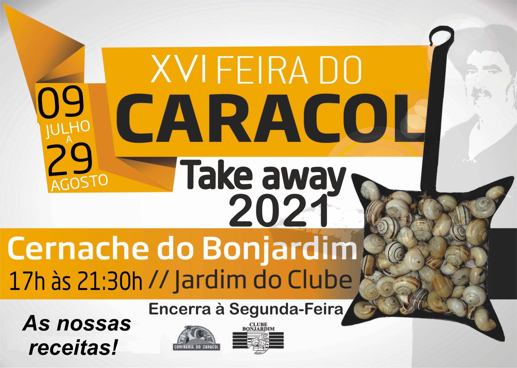 Refira-se que a Feira do Caracol funcionará de terça a domingo, das 17 horas às 21h30m, apenas em regime de take away, no Jardim do Clube Bonjardim, em Cernache do Bonjardim. Os pedidos deverão ser feitos através dos contactos 936509028 e 933564758.