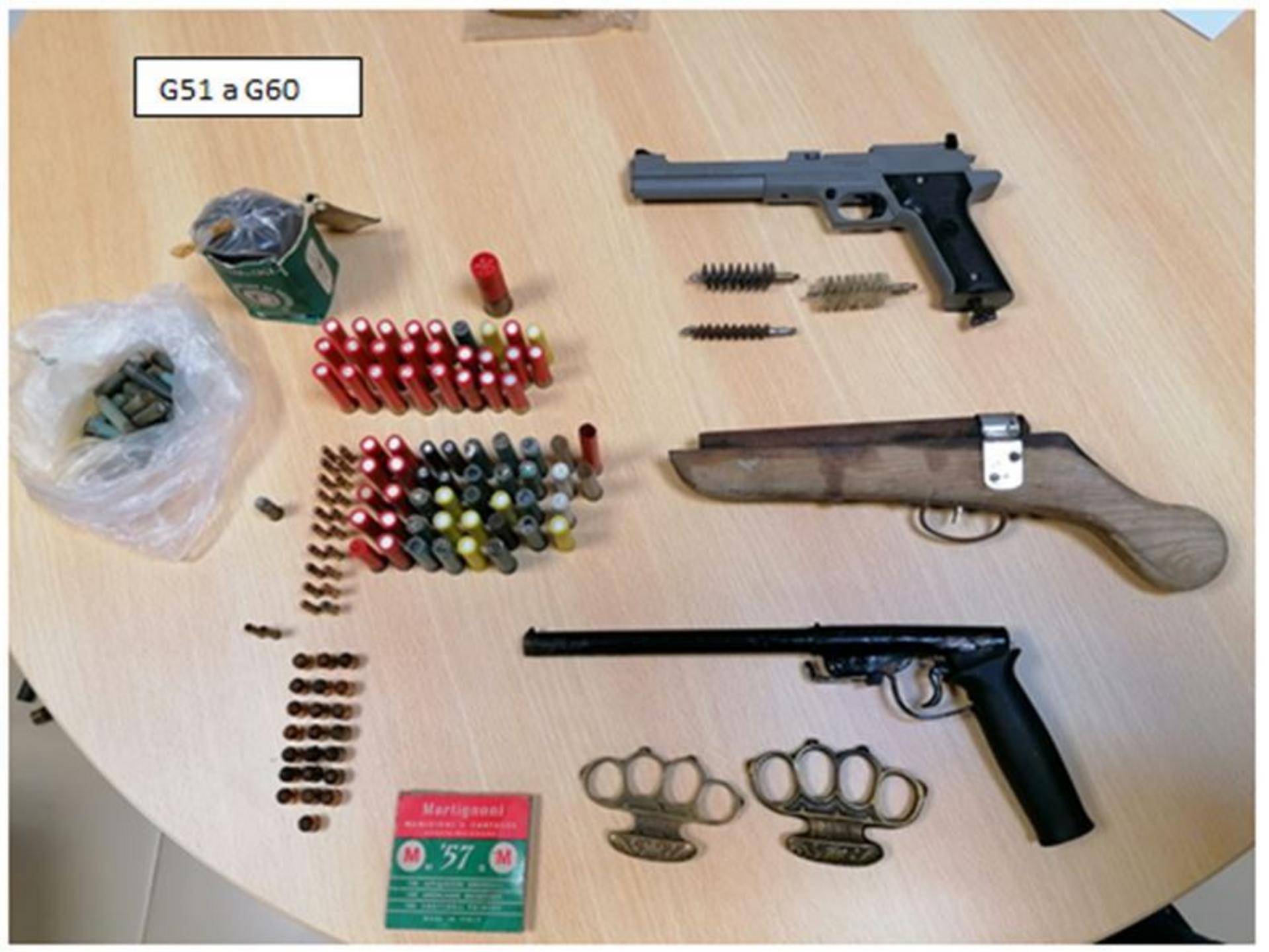 Duas Armas de fogo artesanais; uma réplica de arma de fogo; quatro espingardas de ar comprimido; três munições de calibre 9mm; 27 cartuchos de calibre 12GA; 59 cartuchos de calibre .36; 21 munições de calibre .22LR; 23 cartuchos de calibre 9mm; três munições de salva de calibre 7,62mm; duas munições de salva de calibre .22; 22 fulminantes de 9 mm; duas caixas com projéteis para a arma de ar comprimido; dois artefactos pirotécnicos de categoria 4; duas soqueiras metálicas; 247,5 gr de pólvora e diversos artigos suspeitos de terem sido furtados em residências do concelho de Tomar e concelhos limítrofes.
