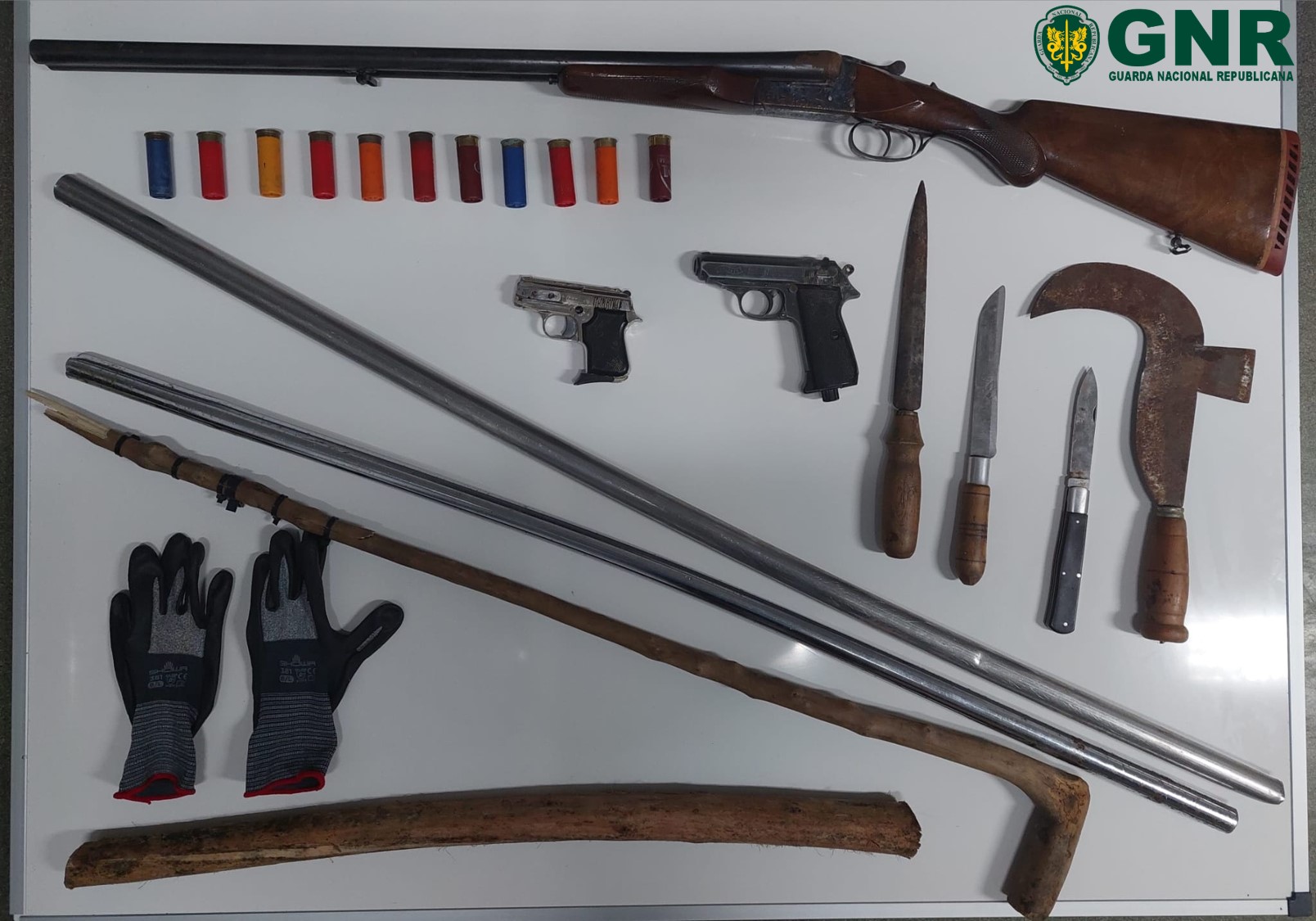 De acordo com A GNR no seguimento da ação foi dado cumprimento ao mandado de detenção e foram ainda realizadas duas buscas, uma domiciliária e uma em veículo. Estas buscas, indicou a GNR em comunicado culminaram na apreensão do seguinte material: uma arma de caça; duas pistolas; 11 munições; três facas; uma foice; duas barras de ferro; dois bastões de madeira; e um par de luvas.