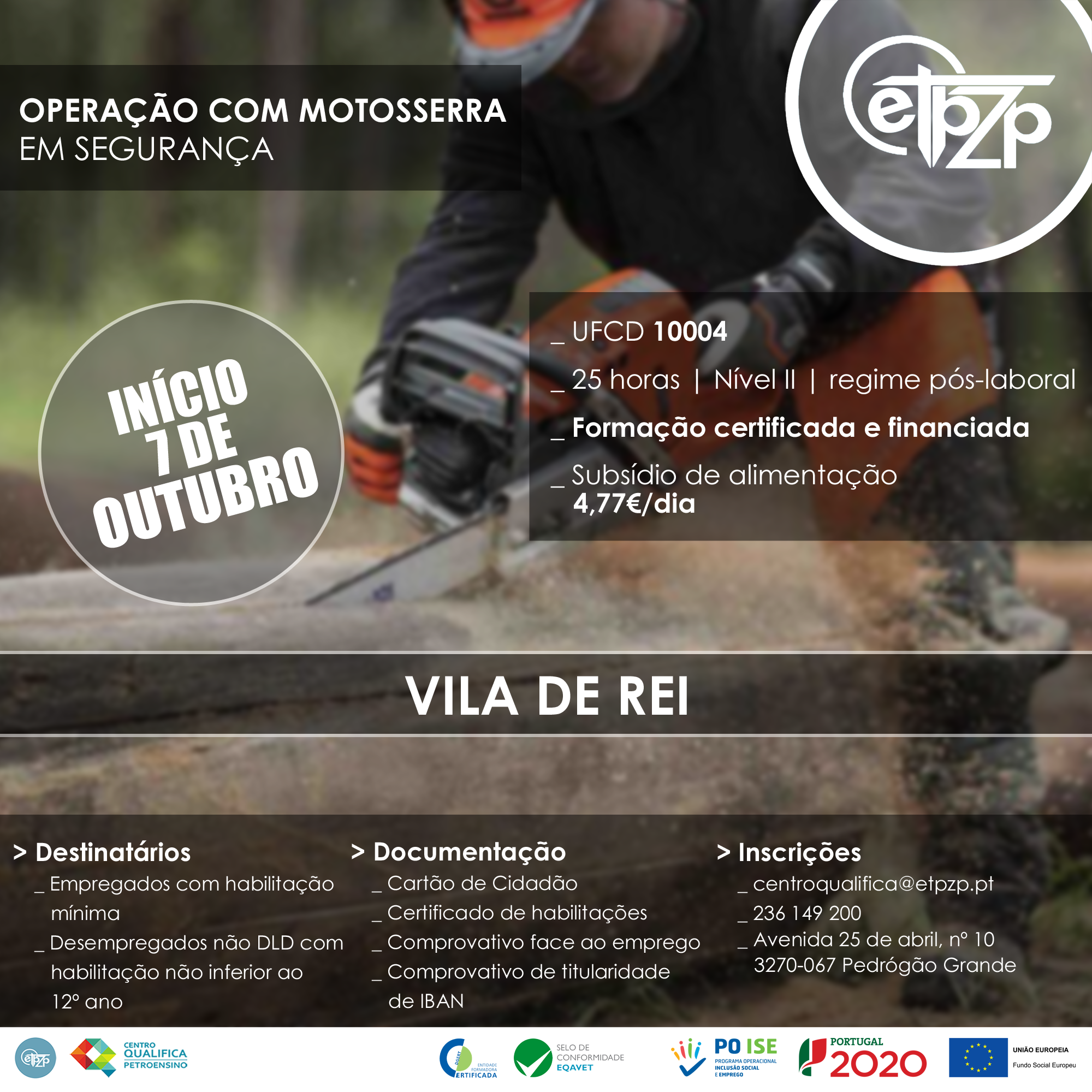 A Escola Tecnológica e Profissional da Zona do Pinhal e o Município de Vila de Rei encontram-se a promover a formação certificada e financiada ‘Operação com Motosserra em Segurança’, a começar no dia 7 de outubro em Vila de Rei.