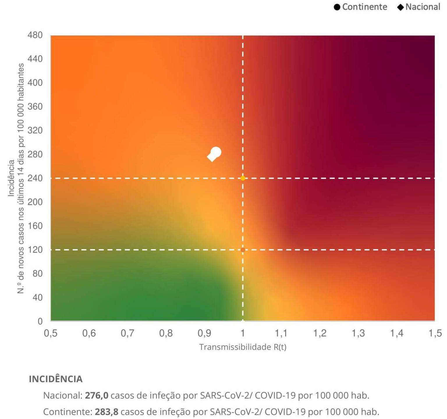 Segundo o boletim epidemiológico conjunto da Direção-Geral da Saúde e do Instituto Nacional de Saúde Doutor Ricardo Jorge divulgado hoje, a taxa de incidência (média de novos casos por 100.000 habitantes nos últimos 14 dias) nacional baixou de 295,5 para 276,0 casos.