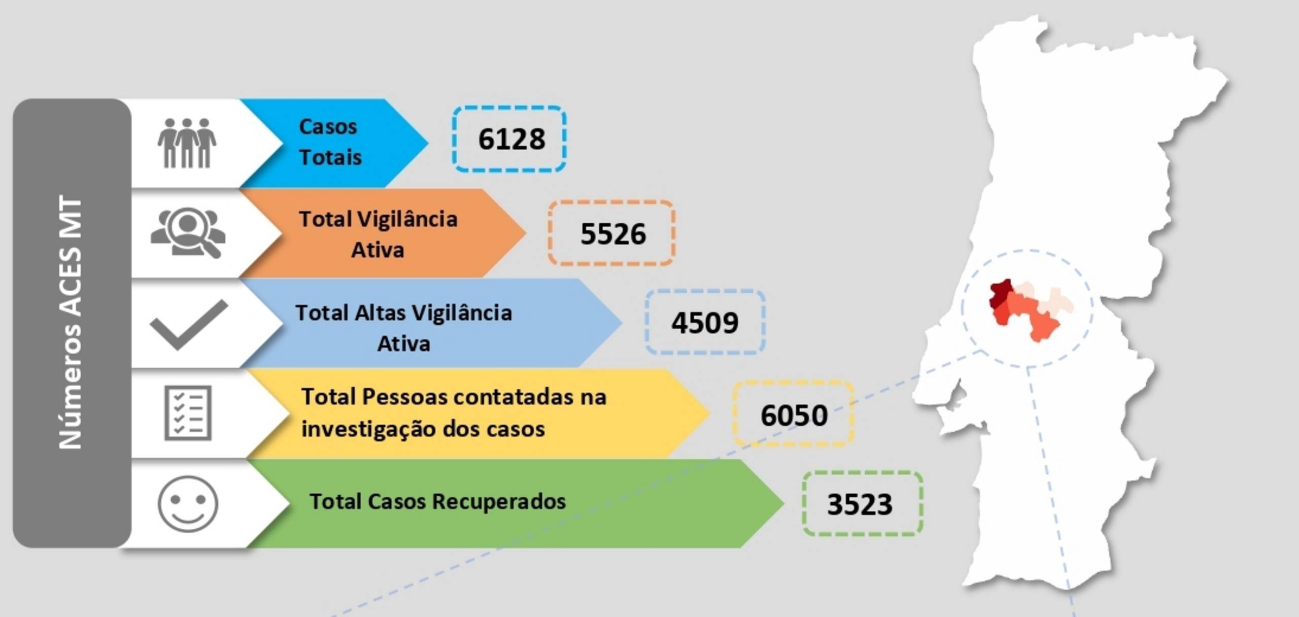 No que diz respeito a vigilâncias ativas, a região já teve 5526 pessoas em confinamento, das quais 4509 tiveram alta. Quer isto dizer que, de acordo com a autoridade de saúde pública do Médio Tejo, há neste momento 1062 pessoas em isolamento profilático por terem tido contactos diretos com infetados.