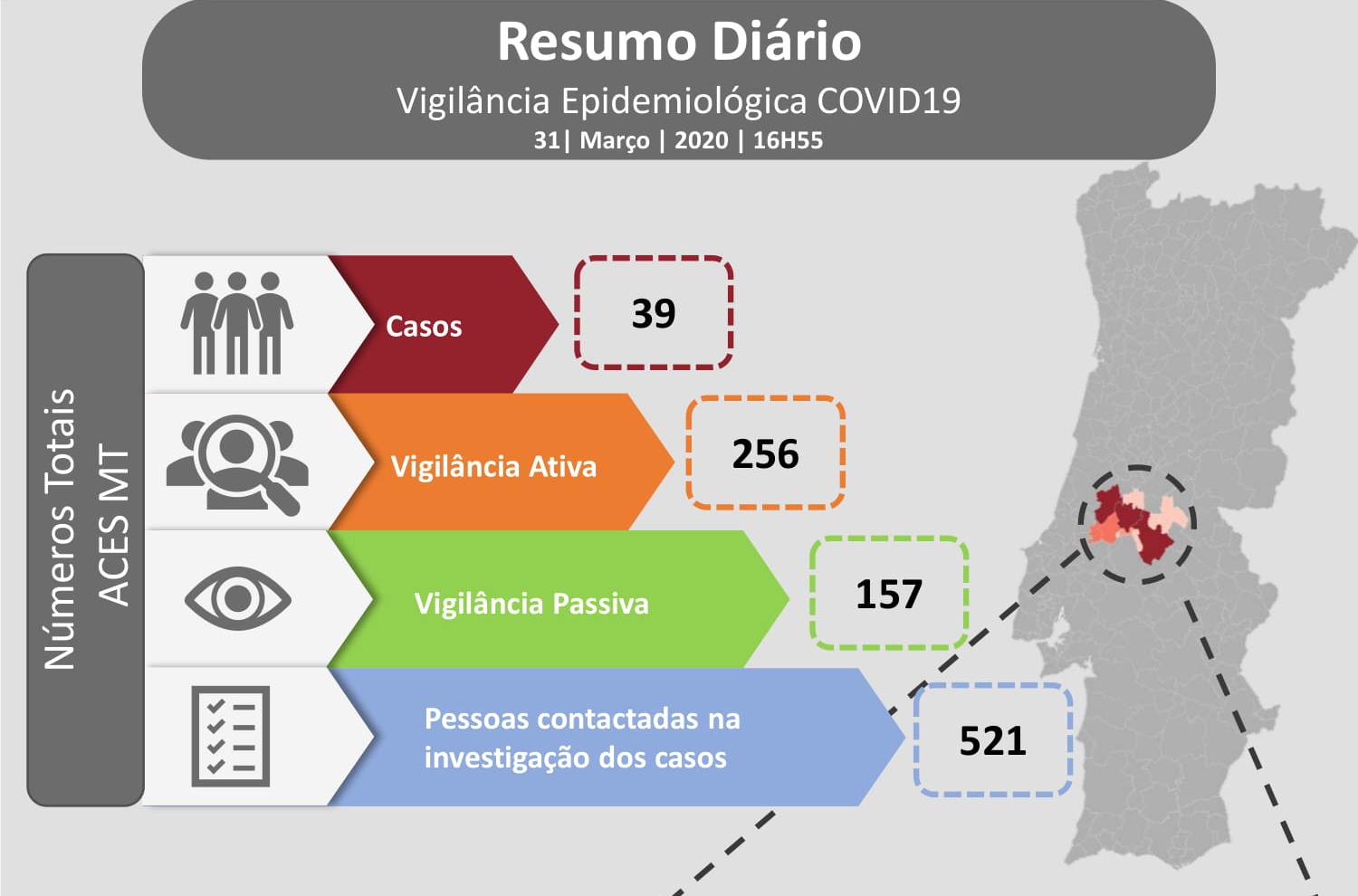 O Médio Tejo, na área do Agrupamento de Centros de Saúde, passou a ter 39 casos positivos de COVID-19. São mais três do que os verificados ontem, nomeadamente mais um caso em Abrantes, outro em Ourém e outro ainda em Alcanena.