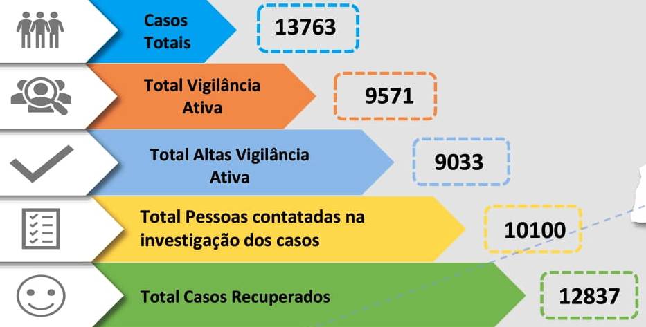 O número de pessoas recuperadas é de 12 837, mantendo-se os óbitos em 379, pelo que o número de casos ativos é neste sábado de 547.