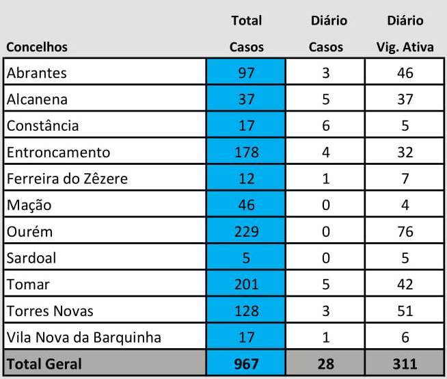 São mais 28 casos positivos que o Médio Tejo registou nas últimas 24 horas de acordo com o relatório epidemiológico deste domingo. Com estes casos o território dos 11 municípios que estão agregados no Agrupamento de Centros de Saúde do Médio Tejo atinge um total acumulado de 967 pessoas infetadas com o coronavírus.