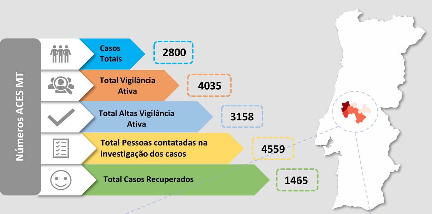 Desde que começou a pandemia [o primeiro caso do Médio Tejo foi registado a 16 de março em Tomar] a Unidade de Saúde Pública do ACES Médio Tejo já colocou em confinamento 4085 pessoas e já fez 4559 contactos epidemiológicos. Nestes contactos enquadram-se as vigilâncias ativas, pessoas infetadas e, eventualmente, contactos secundários ou até terciários daqueles que testaram positivo ao SARS-Cov-2.