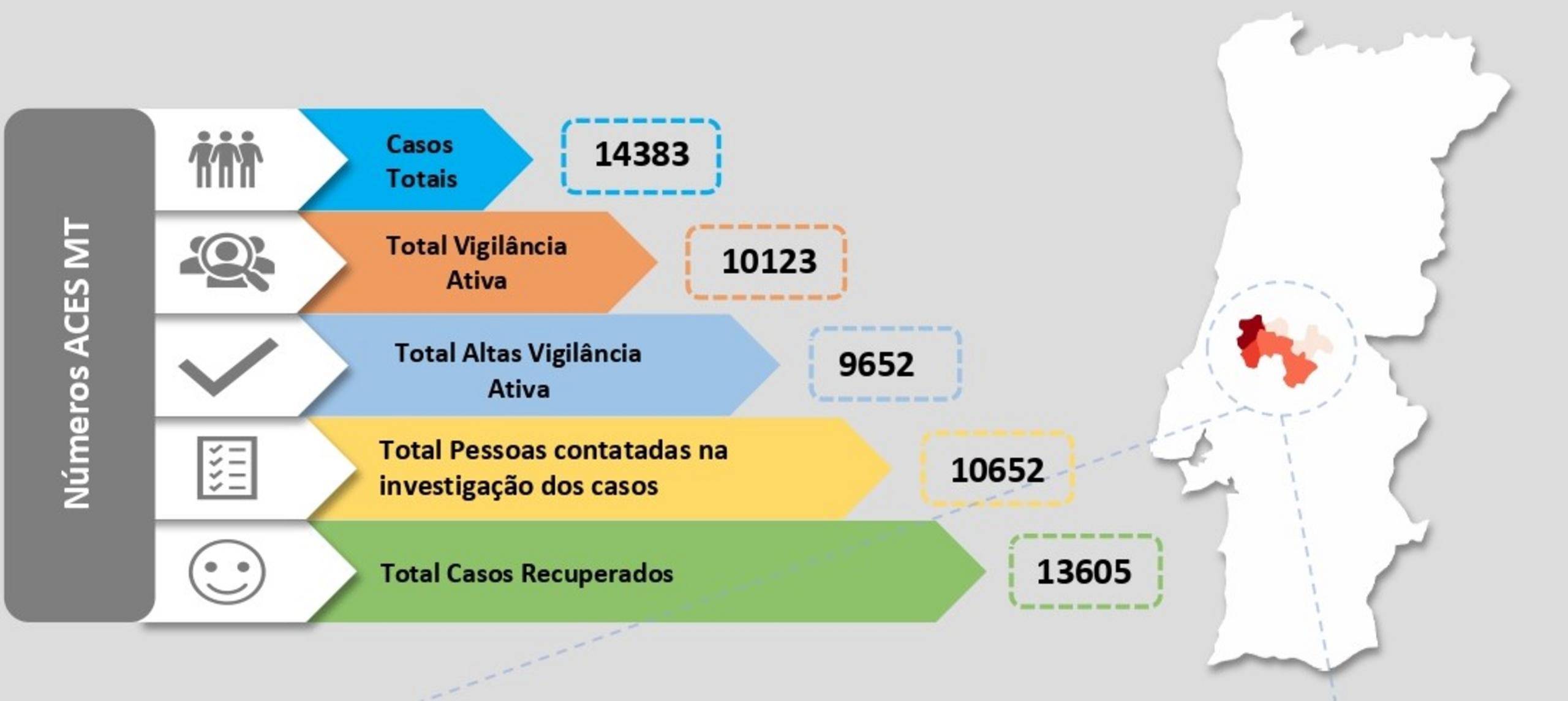 Com esta atualização o número de casos ativos no Médio Tejo é esta segunda-feira de 387 e estão localizados em Abrantes (36), Alcanena (40), Constância (4), Entroncamento (79), Ferreira do Zêzere (5), Mação (17), Ourém (68), Sardoal (6), Tomar (45), Torres Novas (71) e Vila Nova da Barquinha (16).