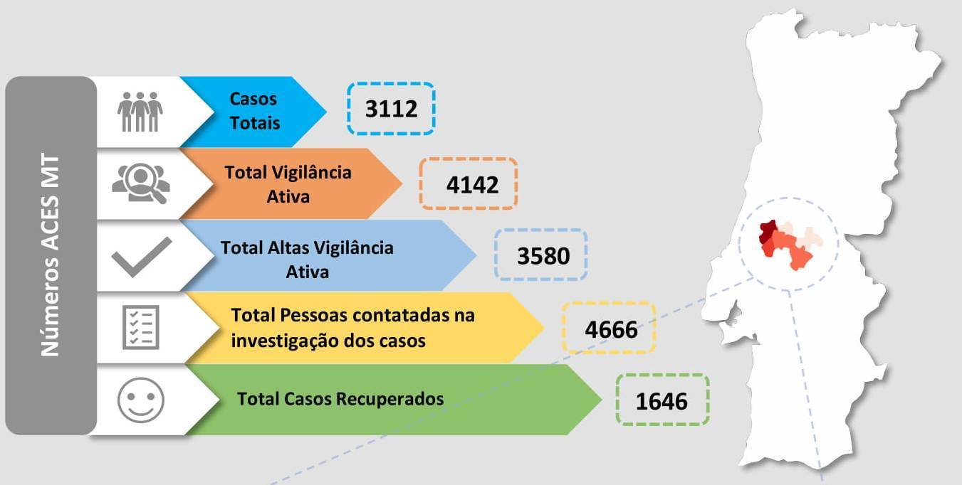 De acordo com o relatório epidemiológico diário da Unidade de Saúde Pública do Agrupamento de Centros de Saúde do Médio Tejo estão registados nesta quarta-feira 604 pessoa sem confinamento por terem contactado com outras pessoas infetadas pelo SARS-Cov-2. Estas pessoas em vigilância ativa estão em Abrantes (66), Alcanena (59), Constância (8), Entroncamento (50), Ferreira do Zêzere (10), Mação (13), Ourém (134), Sardoal (11), Tomar (155), Torres Novas (76) e Vila Nova da Barquinha (22).