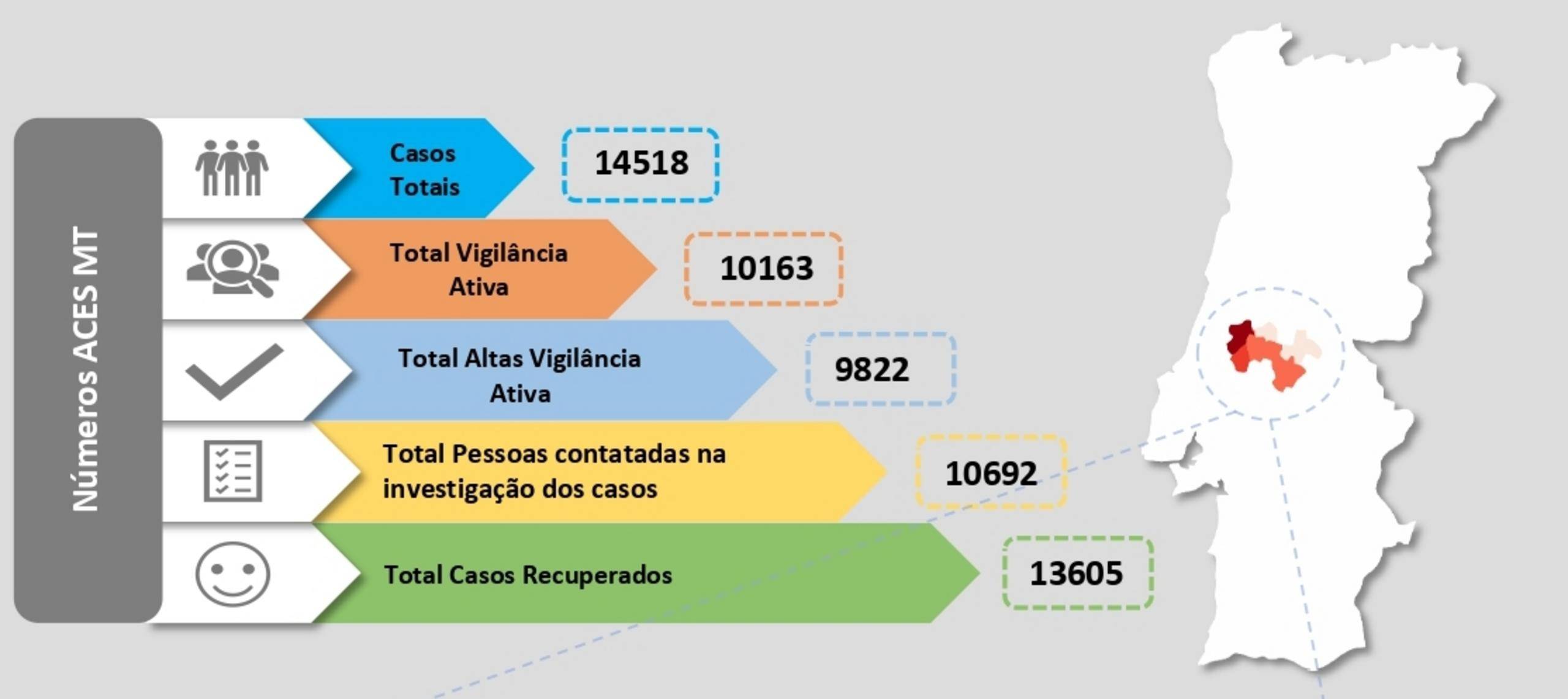 Com esta atualização o número de casos ativos no Médio Tejo é esta sexta-feira, 20 de agosto, de 522 e estão localizados em Abrantes (51), Alcanena (59), Constância (5), Entroncamento (98), Ferreira do Zêzere (5), Mação (24), Ourém (96), Sardoal (7), Tomar (63), Torres Novas (96) e Vila Nova da Barquinha (18).