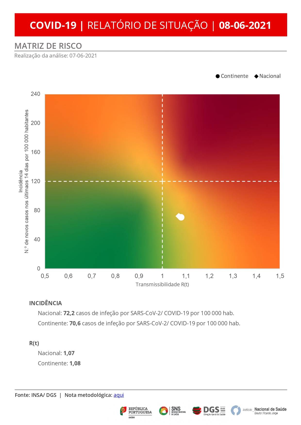 O índice de transmissibilidade (Rt) do coronavírus SARS-CoV-2 em Portugal está atualmente nos 1,07 e a incidência de casos de infeção por 100.000 habitantes subiu em 72,2.