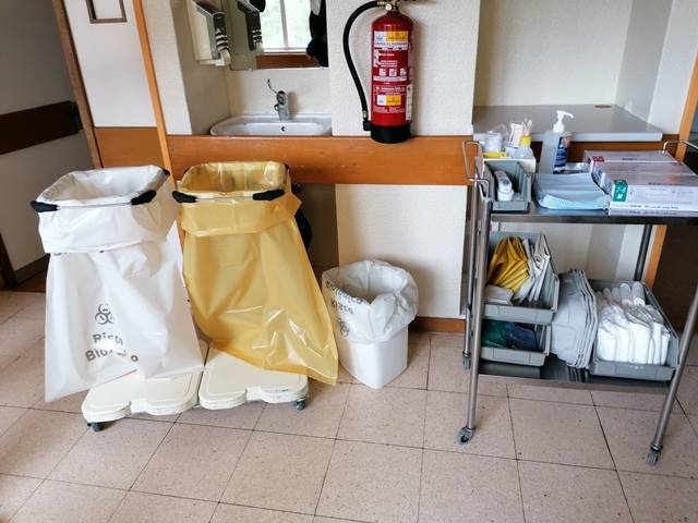 A enfermaria está pronta a receber utentes. Os armários têm os Equipamentos de Proteção para o pessoal, os carrinhos prontos a sair para os corredores e quartos têm também tudo o que é necessário para o trabalho de apoio aos internados.