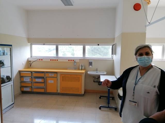Depois não foi esquecida a área para os profissionais, nomeadamente as zonas em que quem trabalha naquele serviço tem de se equipar e depois desequipar. E é o processo de tirar os Equipamentos de Proteção Individual que requer os maiores cuidados e atenção, pois quando alguém sai de uma zona COVID não pode ir contaminar outros espaços exteriores aquela enfermaria. Por isso está bem vincada no chão a linha vermelha que defini os corredores de circulação para evitar os contatos físicos. Há também, segundo a enfermeira Margarida Carmo, uma atenção especial aos limpos e sujos, pois está em causa um vírus muito contagioso por isso, todos os cuidados são poucos.