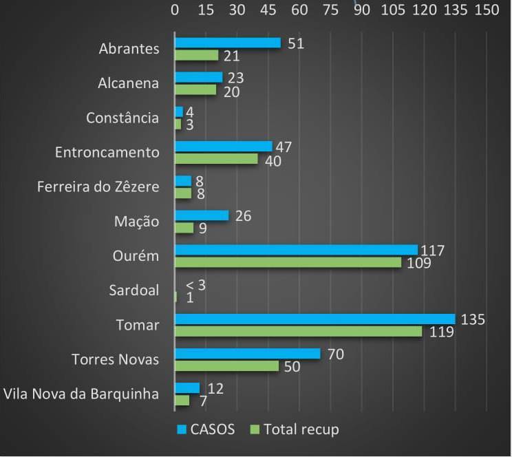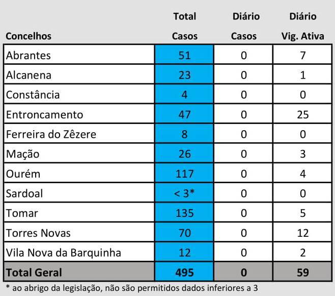 Ainda de acordo com o relatório deste sábado há apenas a registar uma alta da vigilância ativa, pelo que o número de pessoas que se encontram em vigilância por parte da autoridade de saúde voltou a subir. São 59 as pessoas que estão em confinamento em Abrantes (7), Alcanena (1), Entroncamento (25), Mação (3), Ourém (4), Tomar (5), Torres Novas (12) e Vila Nova da Barquinha (2).