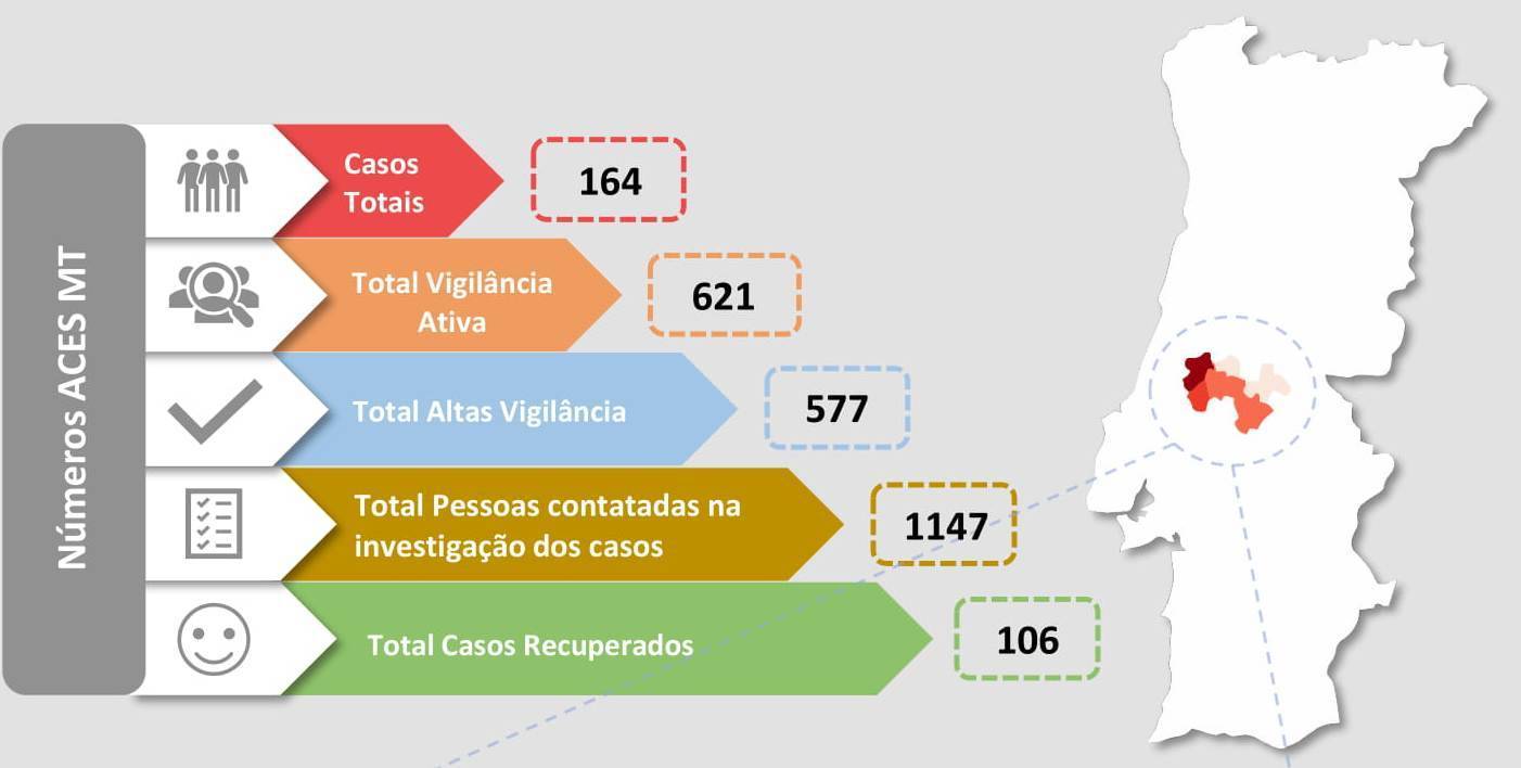 No relatório epidemiológico desta sexta-feira temos então um total de 164 casos positivos, 621 vigilâncias ativas, 577 altas da vigilância ativa, 1147 contactos feitos pela Unidade de Saúde Pública do ACES Médio Tejo, 106 pessoas que já tiveram a doença e que registaram a recuperação total e dois óbitos (Alcanena e Tomar).