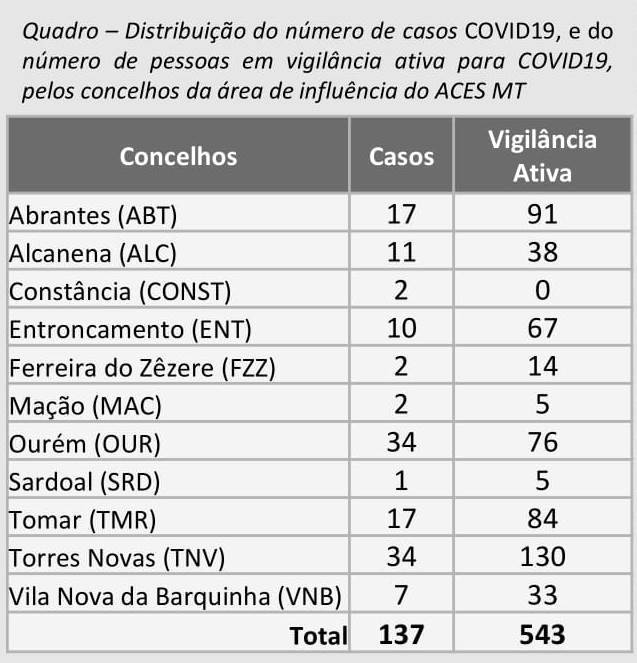Pelo quinto dia consecutivo a área territorial do ACES Médio Tejo, que engloba 11 municípios, continua sem casos novos de pessoas infetadas com o novo coronavírus ou sem suspeitos em vigilância ativa. Aliás, só há duas variações em relação ao dia de ontem e são positivas. Há a registar mais quatro altas da doença COVID-19 e mais uma alta da vigilância ativa.