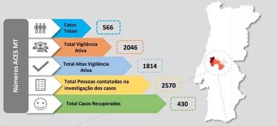 Quanto ao registo de infeções ativas, o concelho de Abrantes conta com 55 pessoas infetadas, Alcanena (5), Constância (1), Entroncamento (40), Ferreira do Zêzere (1), Mação (20), Ourém (10), Tomar (15), Torres Novas (23) e Vila Nova da Barquinha (5).