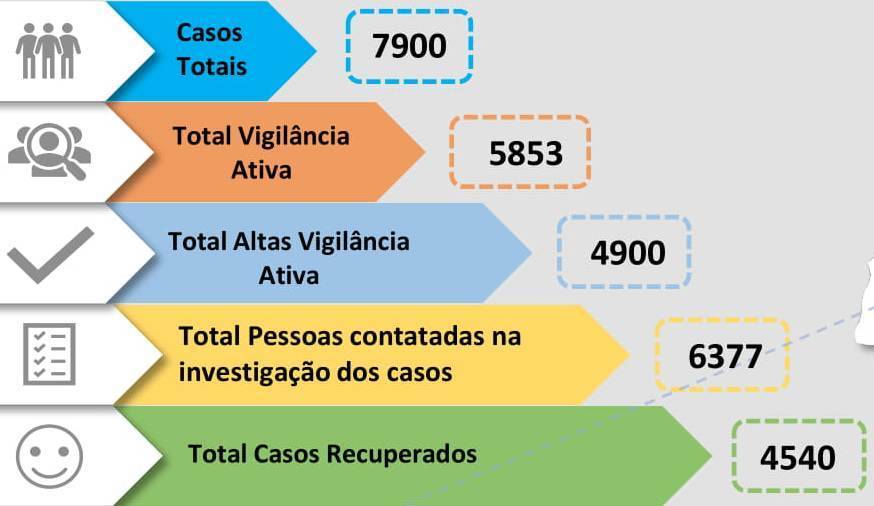 No mapa das vigilâncias ativas a Unidade de Saúde Pública desta região tem 980 pessoas em vigilância ativa, ou seja, pessoas que estão em vigilância porque estiverem expostos a alguém que está infetado com o SARS-Cov-2. Estas pessoas têm o dever de confinamento pelo período estipulado pela autoridade de saúde.