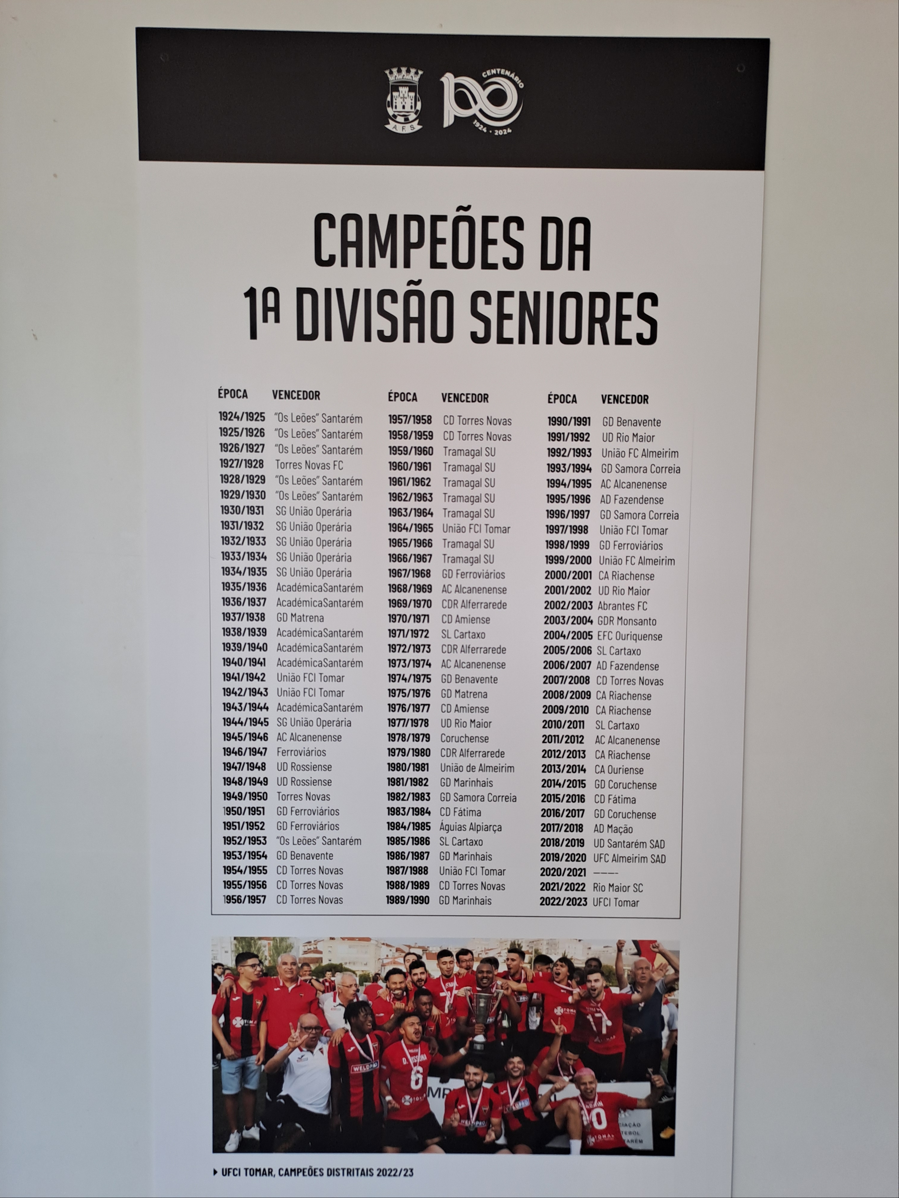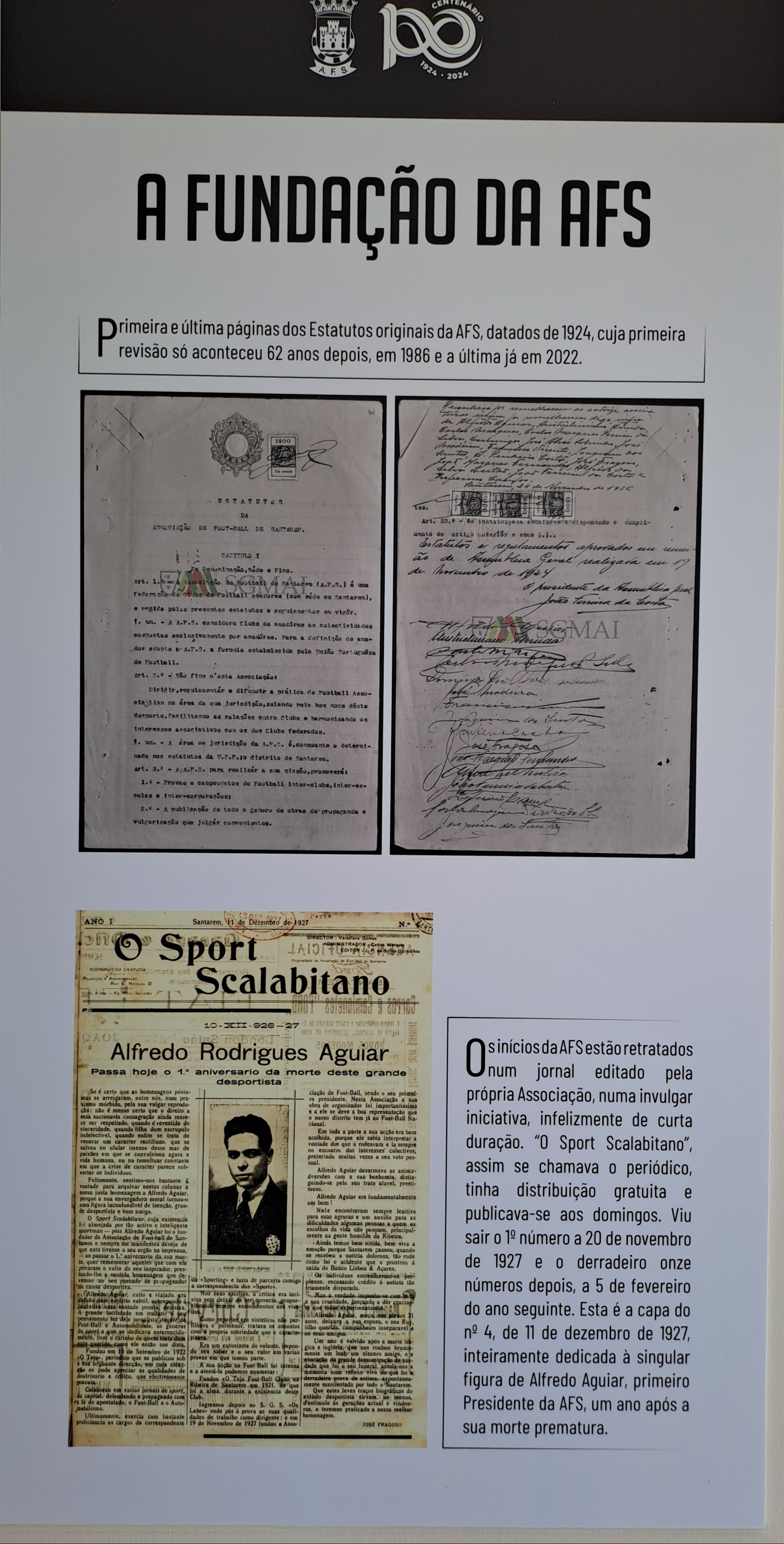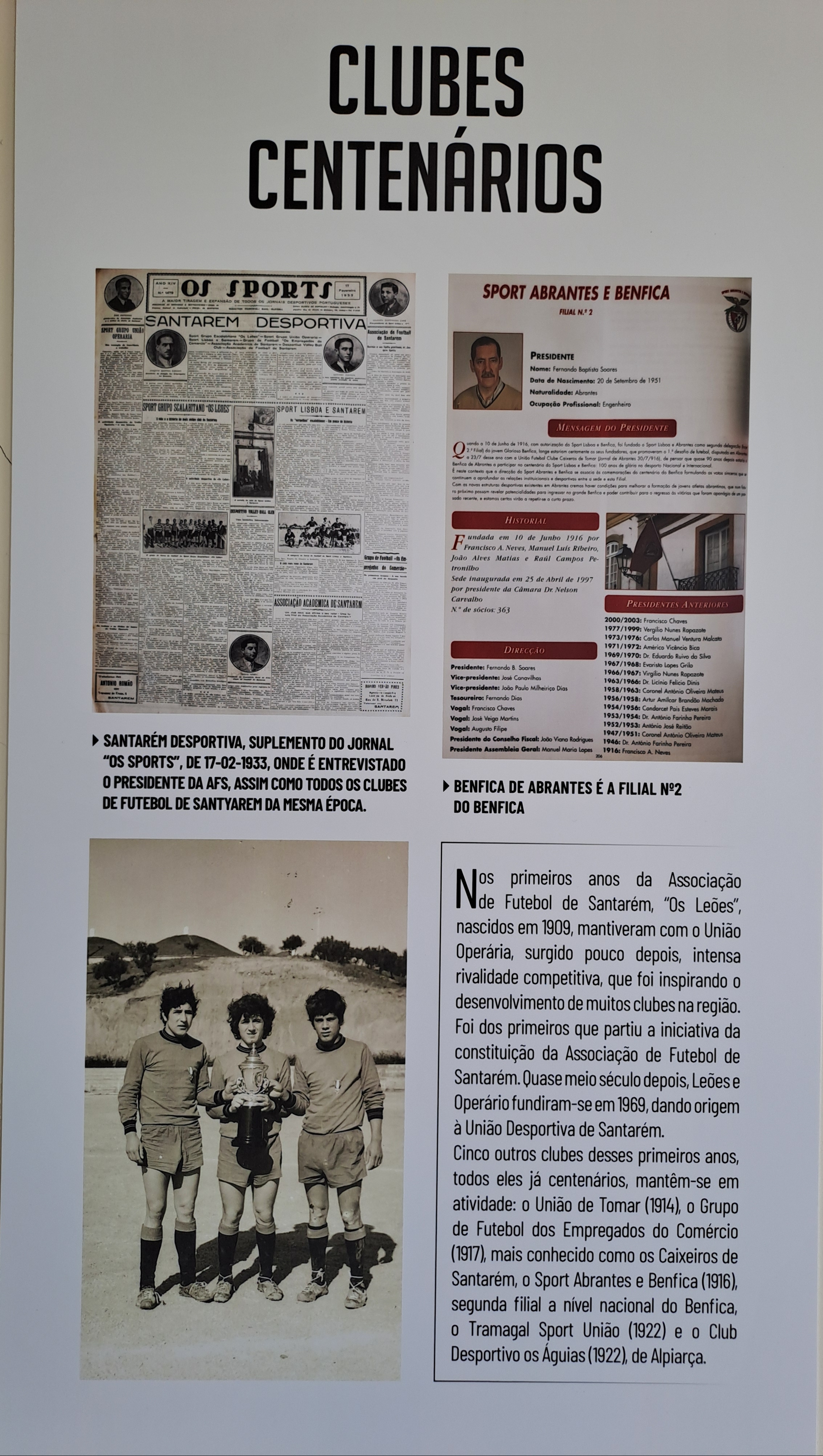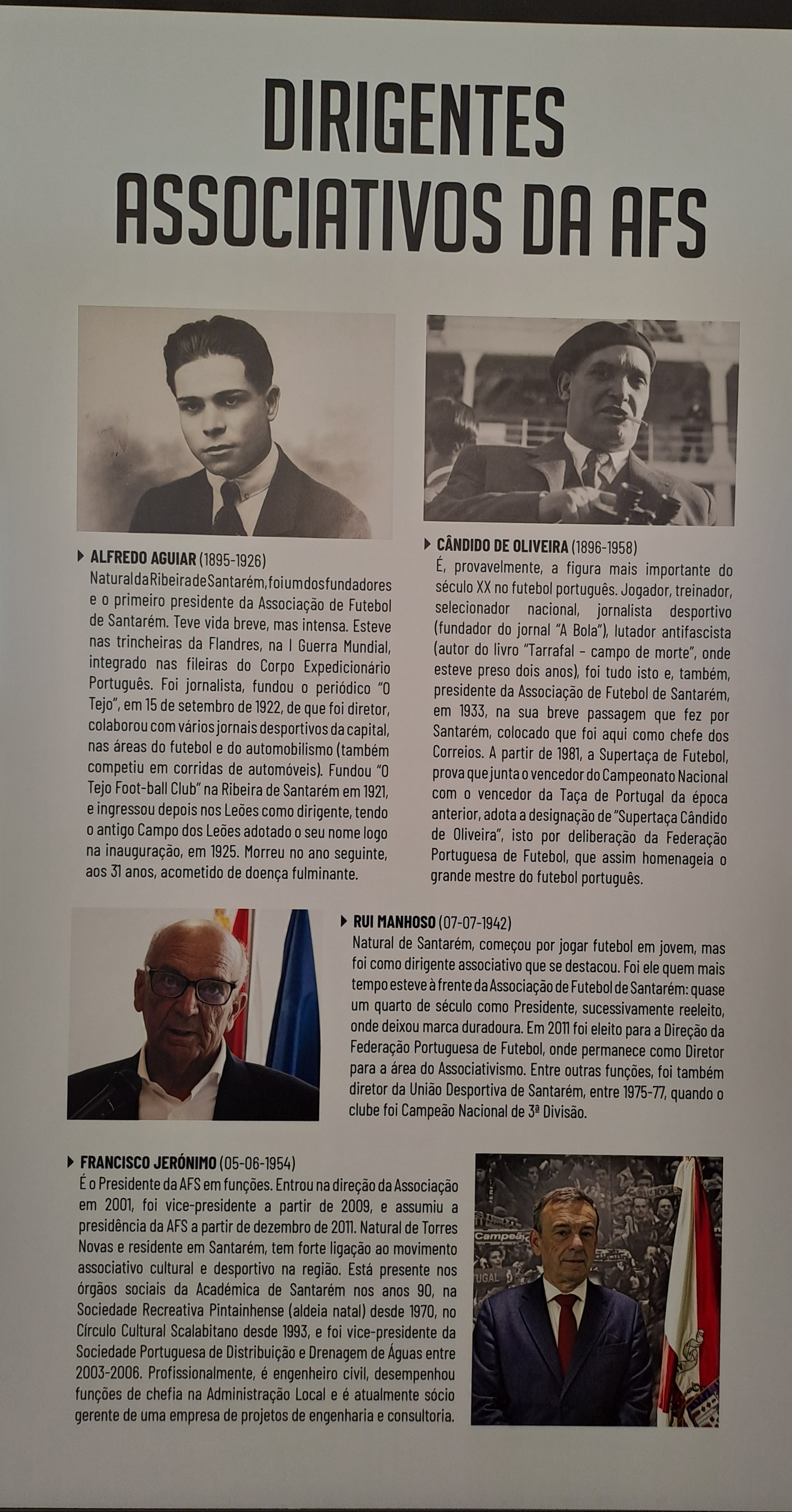 Esta exposição da centenária Associação de Futebol de Santarém regista, nos seus 35 painéis, várias gerações de atletas, de árbitros e dirigentes associativos, alguns deles com nomes gravados a letras de ouro nos anais da Associação. Bastará dizer que nestes 100 anos, a AFS soma um total de perto de 300 clubes filiados, “tantos deles infelizmente já extintos ou desativados”, assim como a linhagem de 30 presidentes nas sucessivas Direções da AFS.