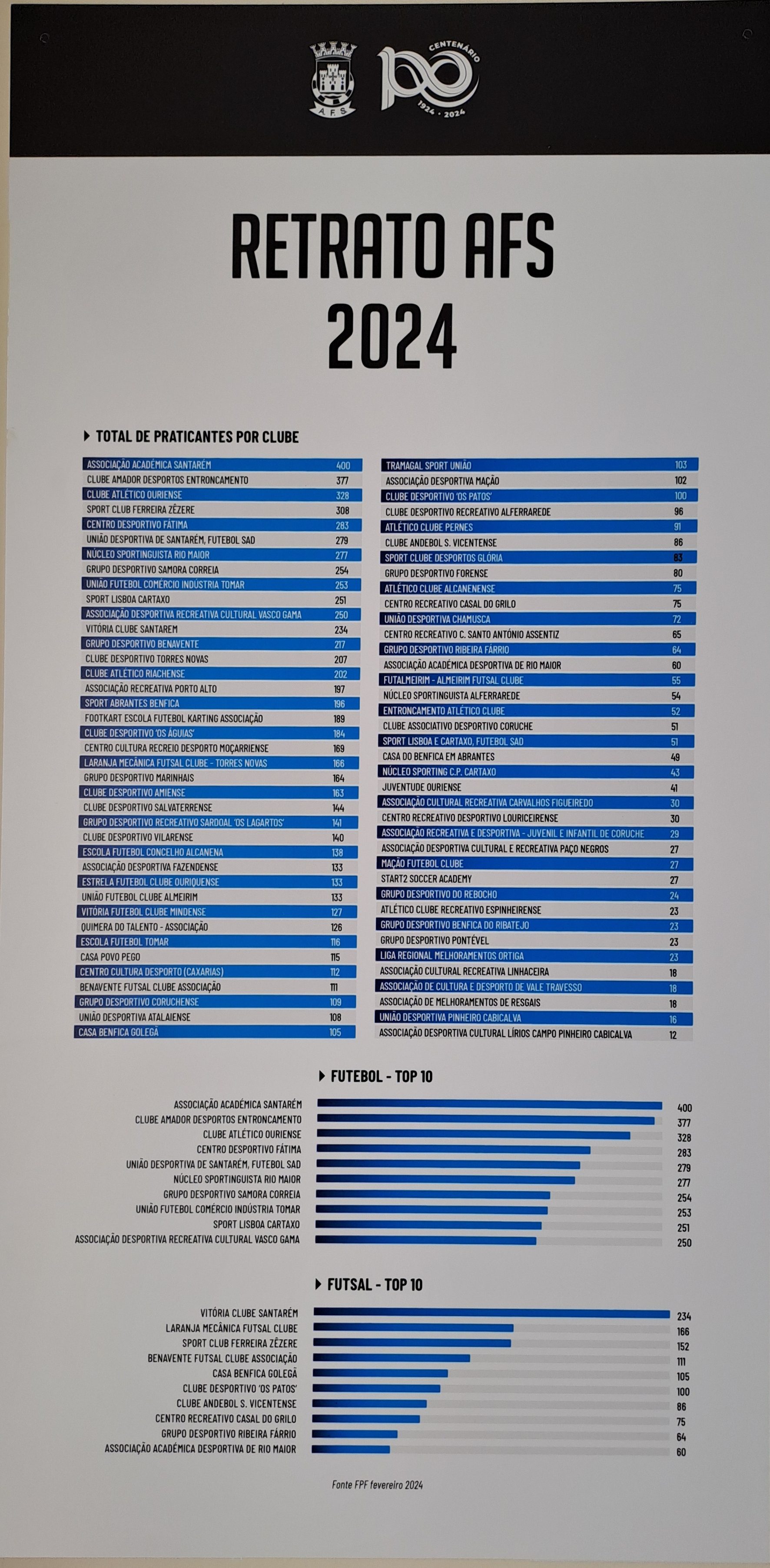 Atualmente, a Associação de Futebol de Santarém conta com 78 clubes no ativo e mais de 9.600 atletas inscritos, o que faz dela uma das mais relevantes Associações da Federação Portuguesa de Futebol.