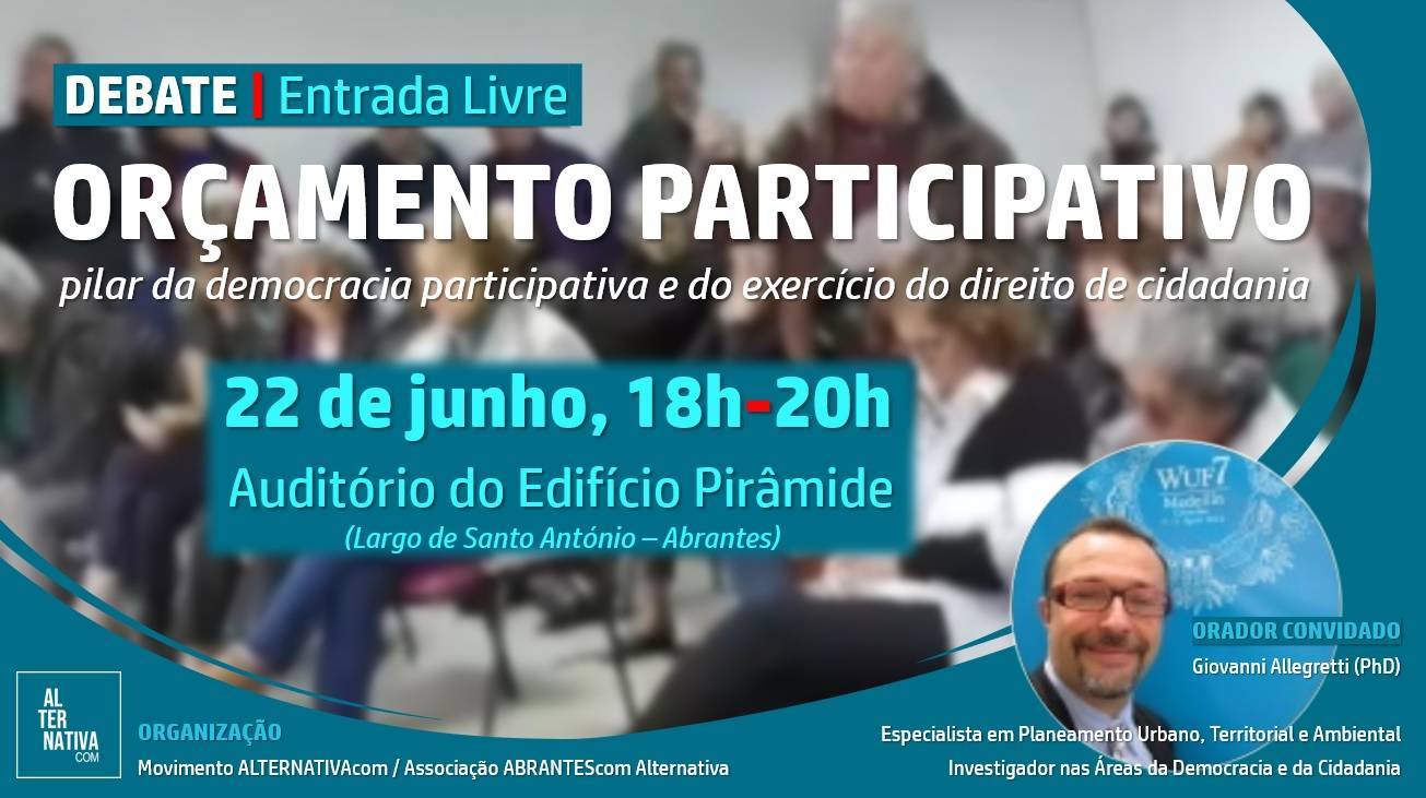 O Movimento ALTERNATIVAcom vai promover esta quarta-feiram dia 22 de junho, uma ação a que chamou “Debate Cívico sobre o Orçamento Participativo de Abrantes”. Trata-se de uma sessão que terá início às 18 horas.