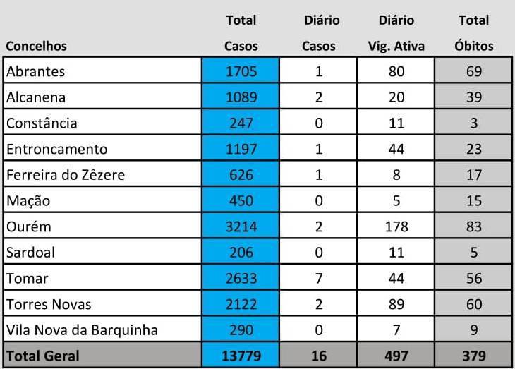 O Médio Tejo tem um registo nesta última segunda-feira de julho de 16 novos infetados com o coronavírus. De acordo com o relatório epidemiológico da Unidade de Saúde Pública do Médio Tejo (USPMT) estes 16 novos casos positivos estão distribuídos por Abrantes (1), Alcanena (2), Entroncamento (1), Ferreira do Zêzere (1), Ourém (2), Tomar (7) e Torres Novas (2).