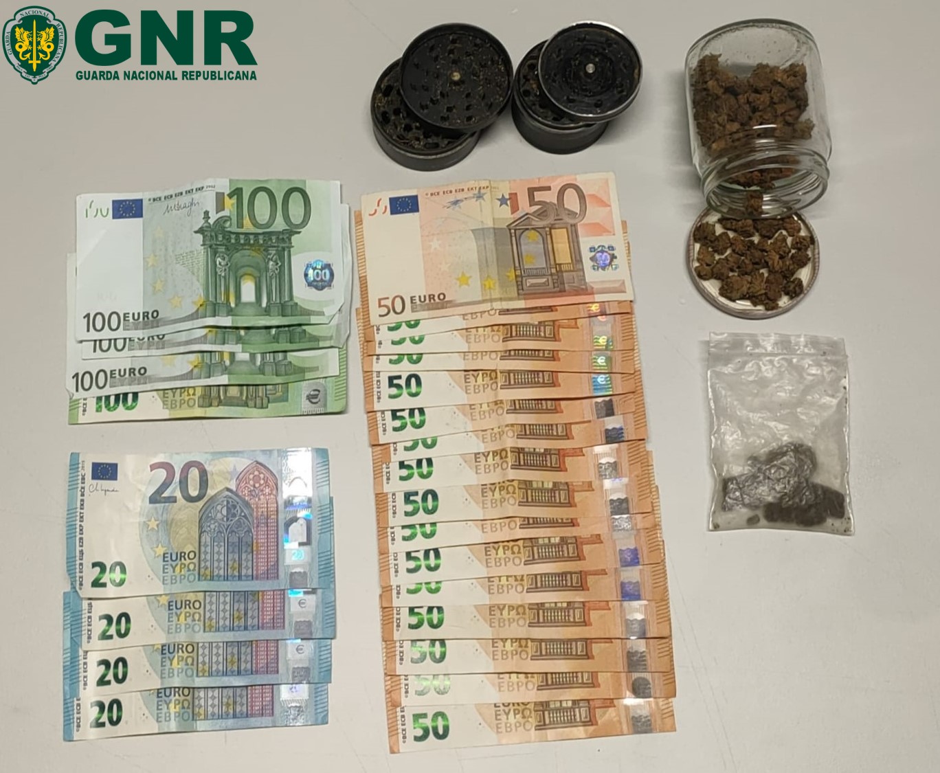 No decorrer das diligências policiais foi ainda efetuada uma busca ao veículo, que culminou na apreensão do seguinte material:17,82 doses de haxixe; 1 280 euros em numerário; Dois “Grinder” trituradores de estupefaciente; Diverso material usado no acondicionamento do produto estupefaciente.
