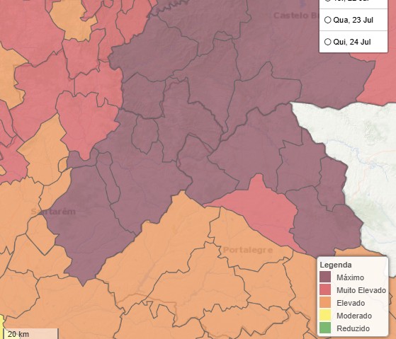 Em perigo máximo de incêndio estão mais de 80 concelhos dos distritos de Bragança, Vila Real, Braga, Viseu, Guarda, Coimbra, Castelo Branco, Portalegre, Santarém e Faro. Segundo o Instituto Português do Mar e da Atmosfera (IPMA), vários concelhos do interior norte e centro e Algarve apresentam hoje perigo muito elevado de incêndio rural.