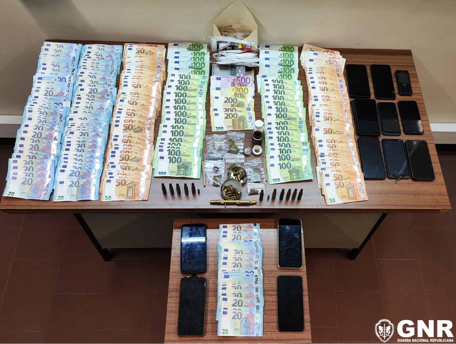 A operação resultou na detenção de cinco suspeitos e na apreensão de diverso material, destacando-se: 50,6 doses de haxixe; 2,1 doses de canábis; Sementes de canábis; Dois cigarros com produto estupefaciente; Uma arma de fogo dissimulada como caneta; 38 munições de diversos calibres; 343 sacos de herméticos destinados ao embalamento e acondicionamento do produto estupefaciente; Uma balança precisão digital; 13 telemóveis; e 23 400 euros em numerário.