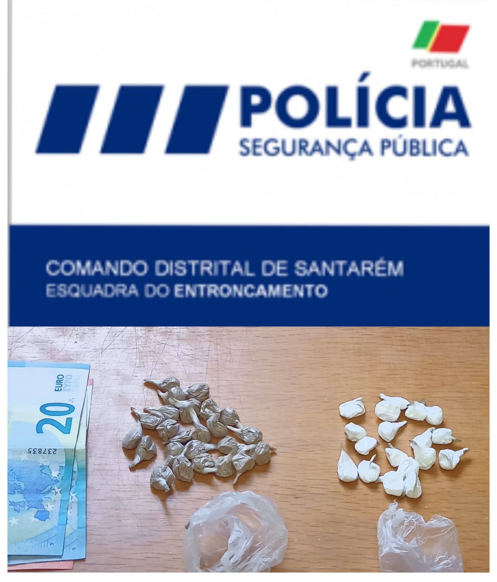 O Comando Distrital da PSP de Santarém, através da Brigada de Investigação Criminal da Esquadra do Entroncamento da Divisão Policial de Tomar, deteve, na terça-feira, dia 29 de março, em flagrante delito, um indivíduo do sexo masculino, com 42 anos de idade, pela prática do crime de tráfico de estupefacientes.
