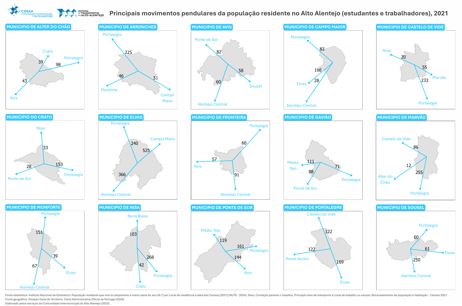 O estudo realizado analisou também os movimentos pendulares diários entre os municípios do Alto Alentejo de acordo com os resultados do recenseamento geral da população mais recentes (Censos 2021), onde foi possível apurar o número médio de pessoas que todos os dias se deslocam entre municípios do Alto Alentejo e ainda regiões contíguas.