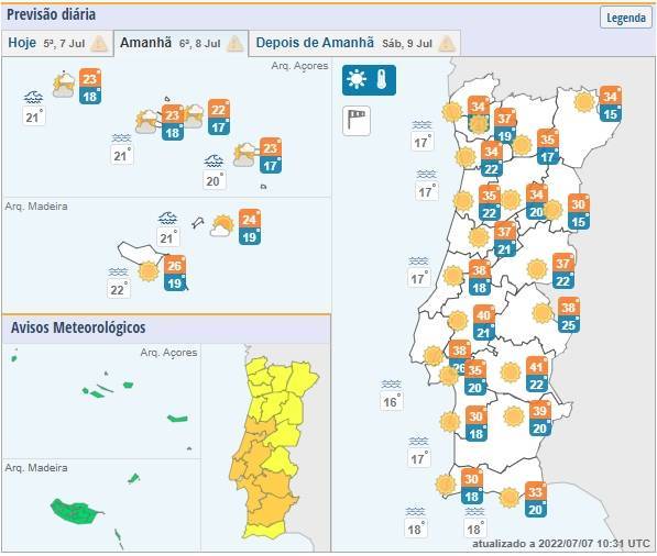 Já no sábado, ainda segundo a página do IPMA, já quase todos os distritos de Portugal estão com alerta laranja, à exceção de Faro, Viana do Castelo, Aveiro, Viseu e Guarda.